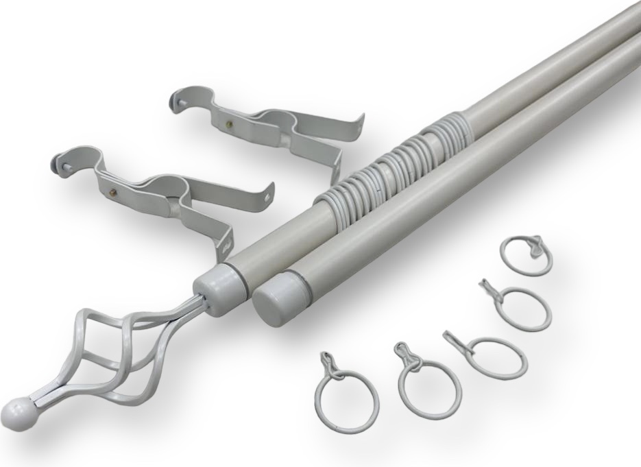 Комплектация: наконечники 2 шт, заглушки 2 шт,кронштейны 3 шт, кольца 48 шт,крючки 48шт,28мм и 25 мм труба