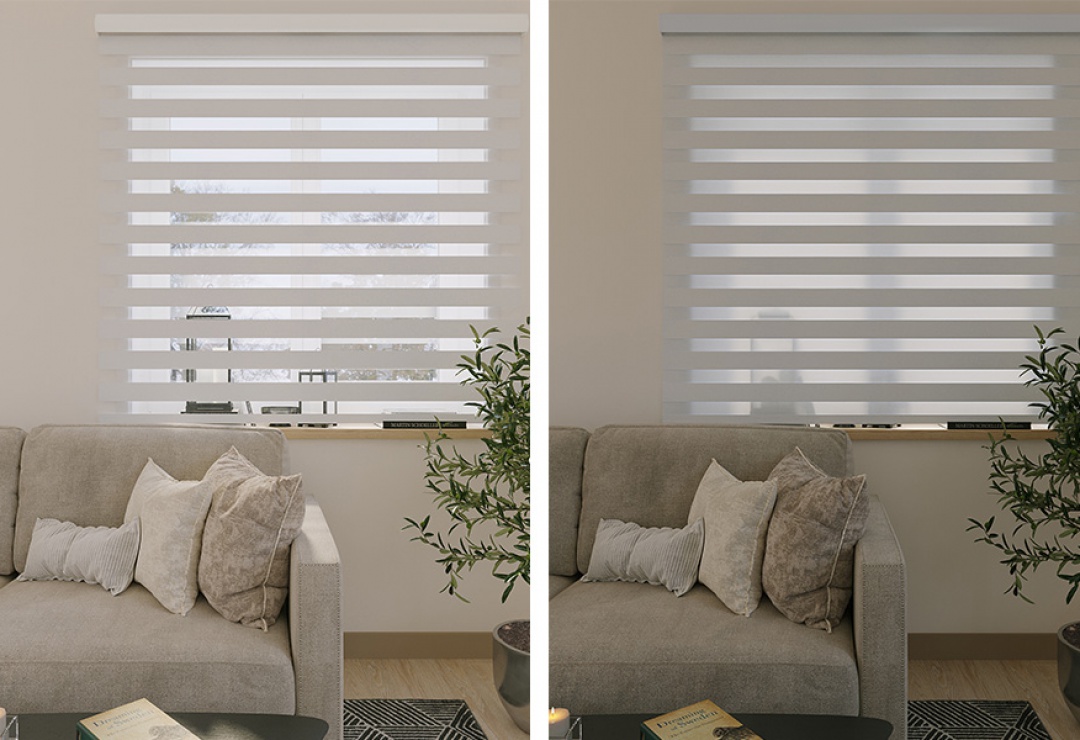Режим «День». Полосы полотна чередуются: светопроницаемые и блокирующие свет. В этом случае в комнату попадает 50% света за счет чередования полос.