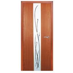 Каркас дверного полотна из плит МДФ 28*24, внутреннее заполнение полотна-сотовый заполнитель, закладной брусок под защелку 200*80, облицовочная панель выполнена из плит МДФ 3мм, декорированных финиш-пленкой пр-во Польша, Германия, меламиновая кромка, в цвет полотна, защищает торцы полотна, зеркальная вставка с пескоструймым рисунком