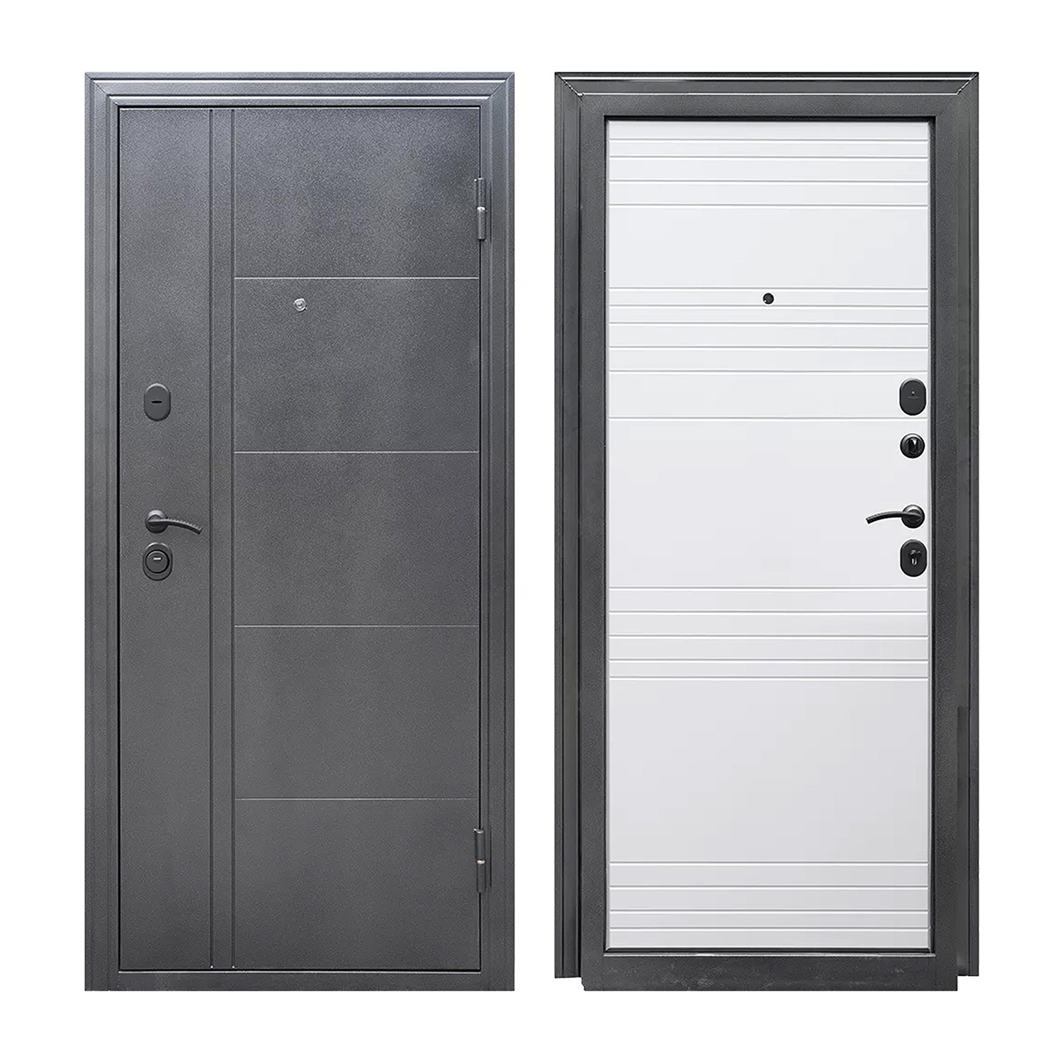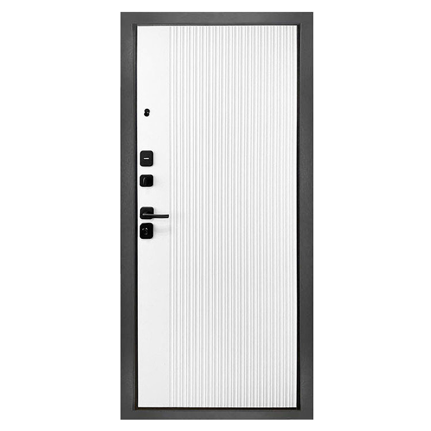 Предназначена для установки в жилых и общественных зданиях в качестве входной двери внутри помещения. Полотно изготовлено из стали. С внутренней стороны облицовано фрезерованной МДФ-панелью толщиной 8 мм. Стальной лист 1 мм с атмосферостойким порошковым покрытием цвета "антик серебро"; панель МДФ, толщиной 8 мм в цвете "белый софт"; наполнение базальтовая плита.