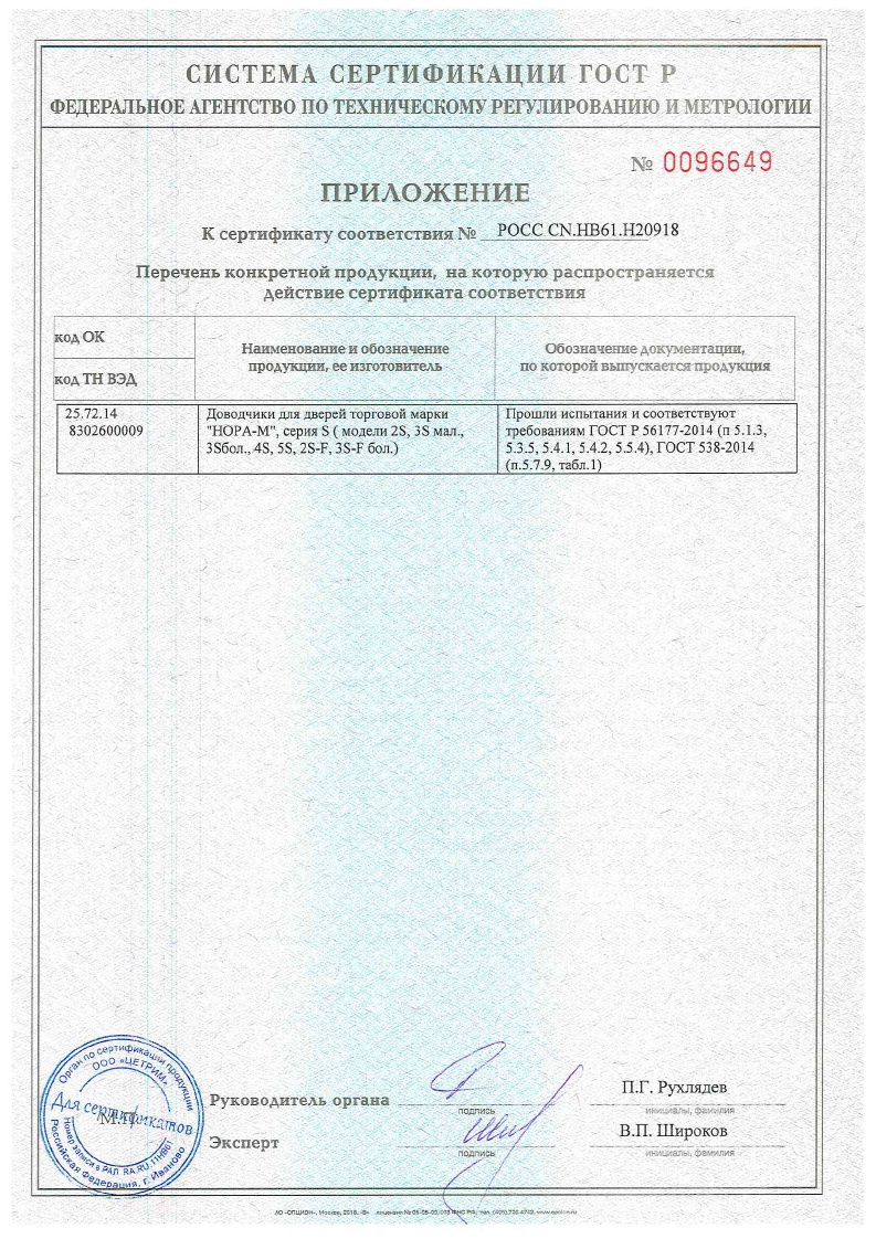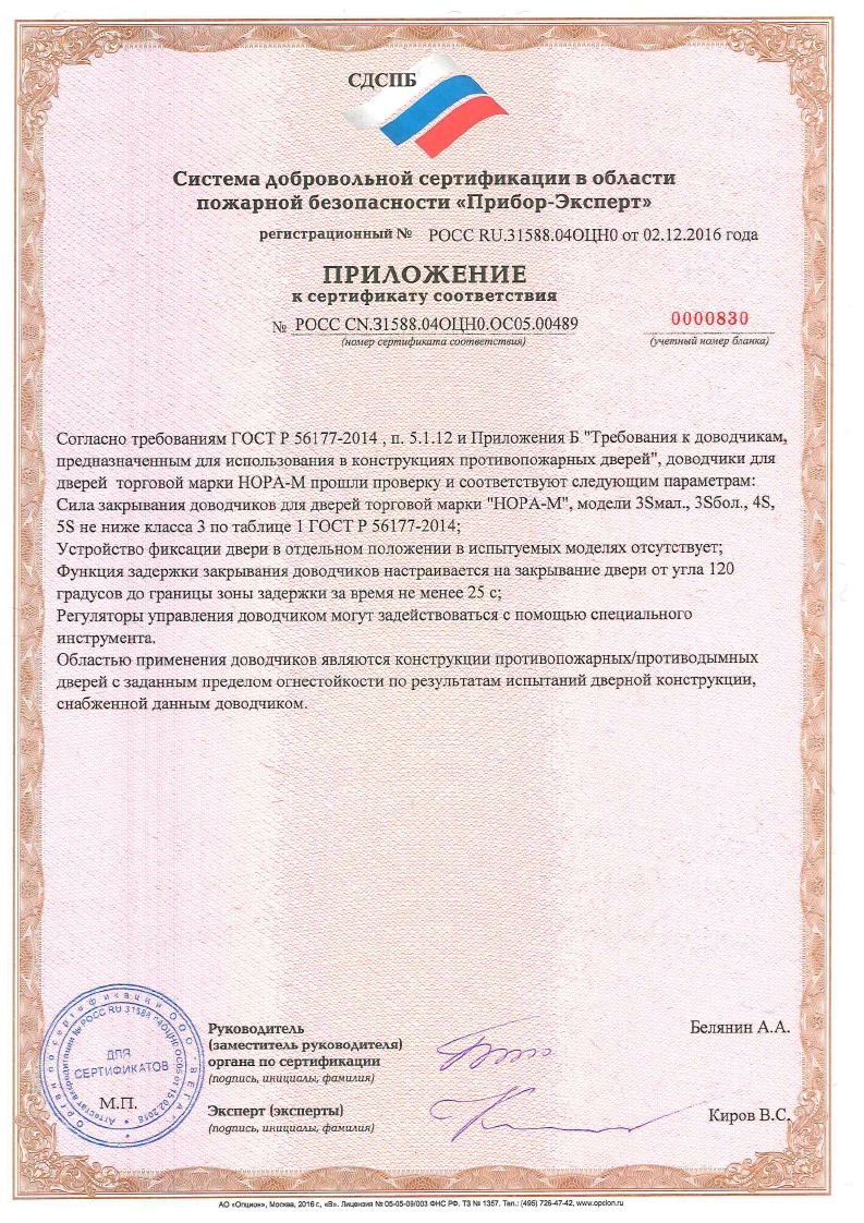 Модель 3S с большим рычагом - доводчик для противопожарных дверей. Он имеет сертификат соответствия требованиям ГОСТ Р 56177-2014, п. 5.1.12, Приложение Б "Требования к доводчикам, предназначенным для использования в конструкциях противопожарных/противодымных дверей".