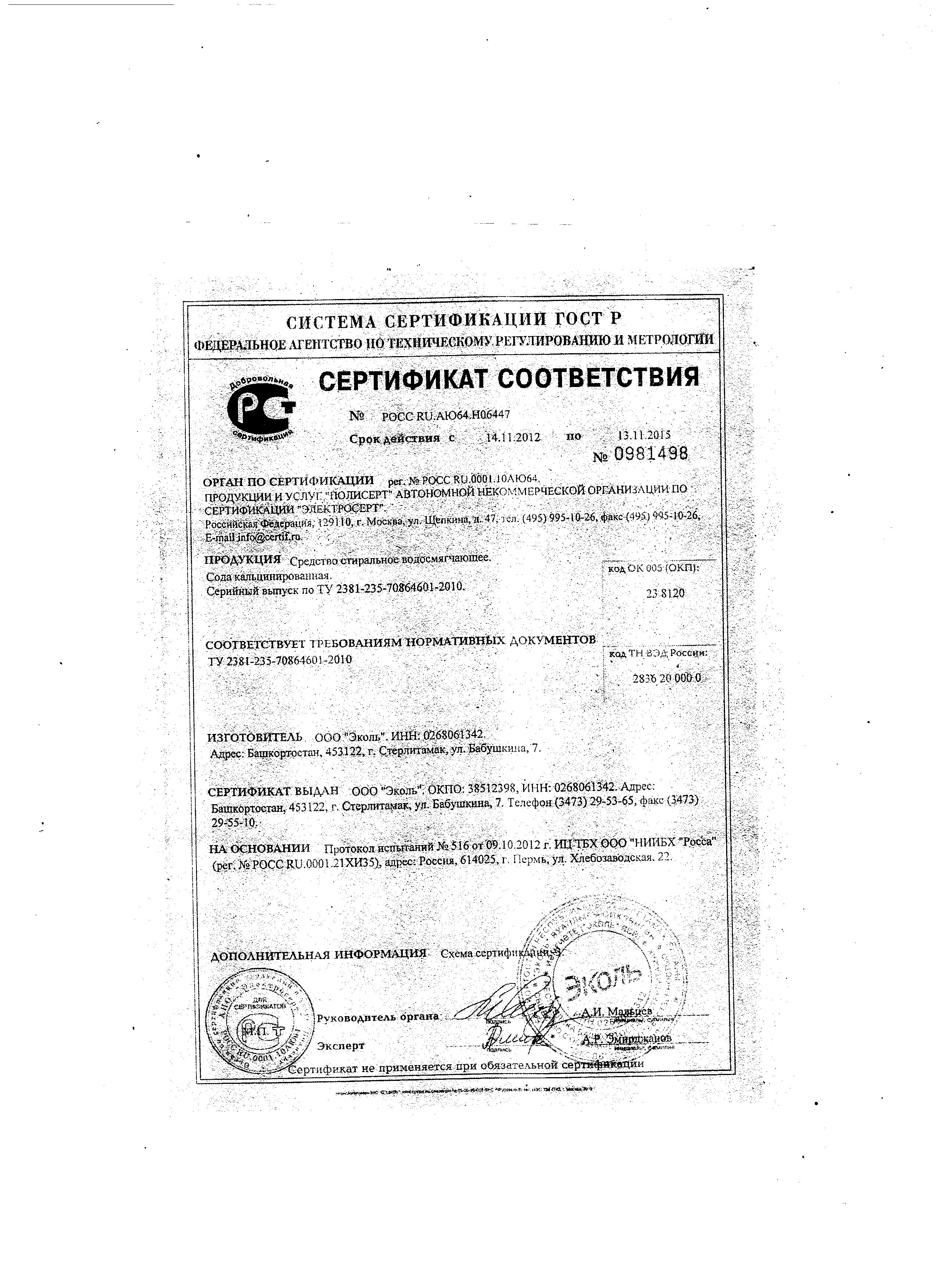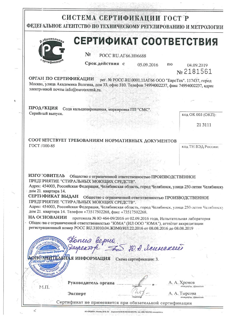 Сода кальцинированная (натрий углекислый) применяется для мытья фарфоровой, фаянсовой, эмалированной, керамической посуды, чистки кафеля, раковин, ванн, линолеума, стирки и кипячения, замачивания хлопчатобумажных, льняных тканей, смягчения воды и пр.