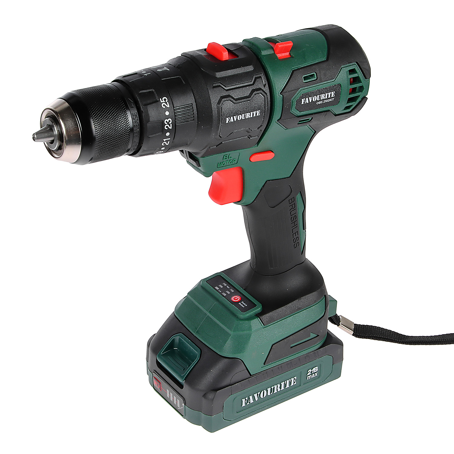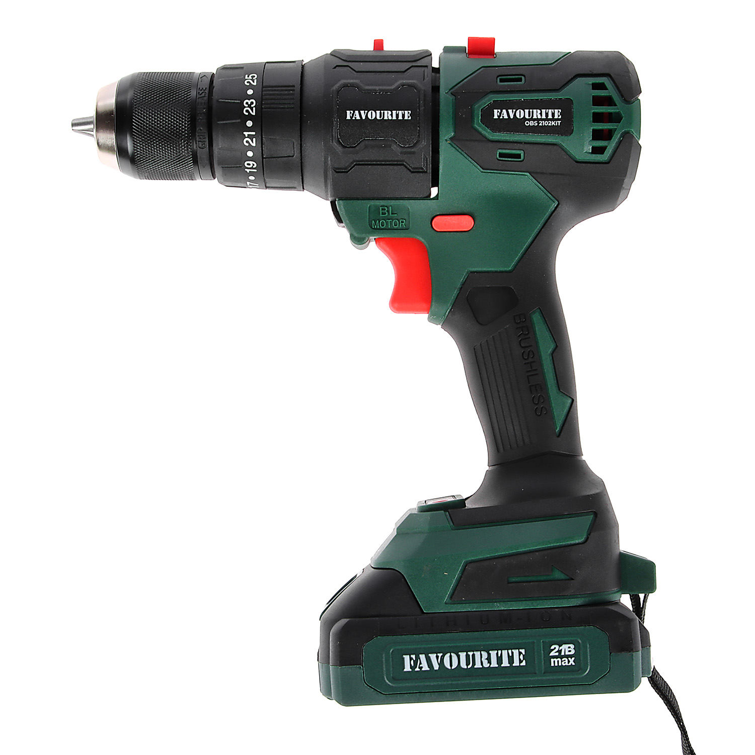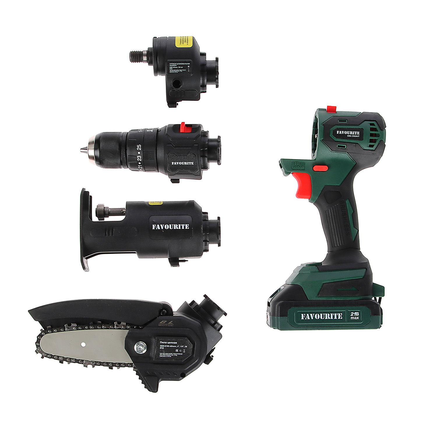FAVOURITE OBS 2102KIT — аккумуляторный 21 В многофункциональный инструмент 4 в 1 для домашнего использования построенный на базе бесщеточного двигателя. Является частью линейки One Battery System, обеспечивающей совместимость одного и того же аккумулятора с целым рядом инструмента. Уникальность модели состоит в возможности применения специальных сменных насадок, благодаря чему мультитул OBS 2102KIT способен заменить сразу четыре инструмента различного назначения: шуруповерт, лобзик, садовую цепную пилу и угловую шлифовальную машину: