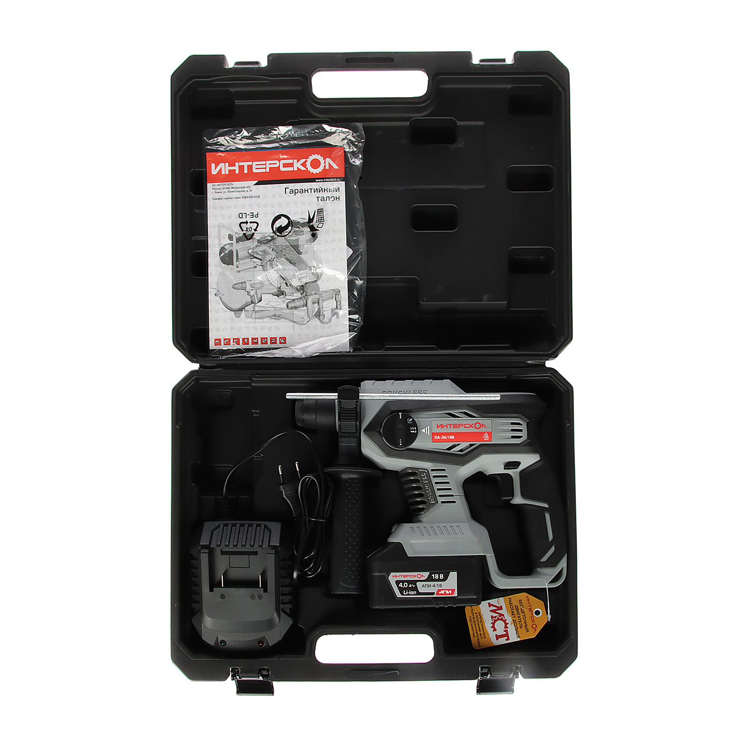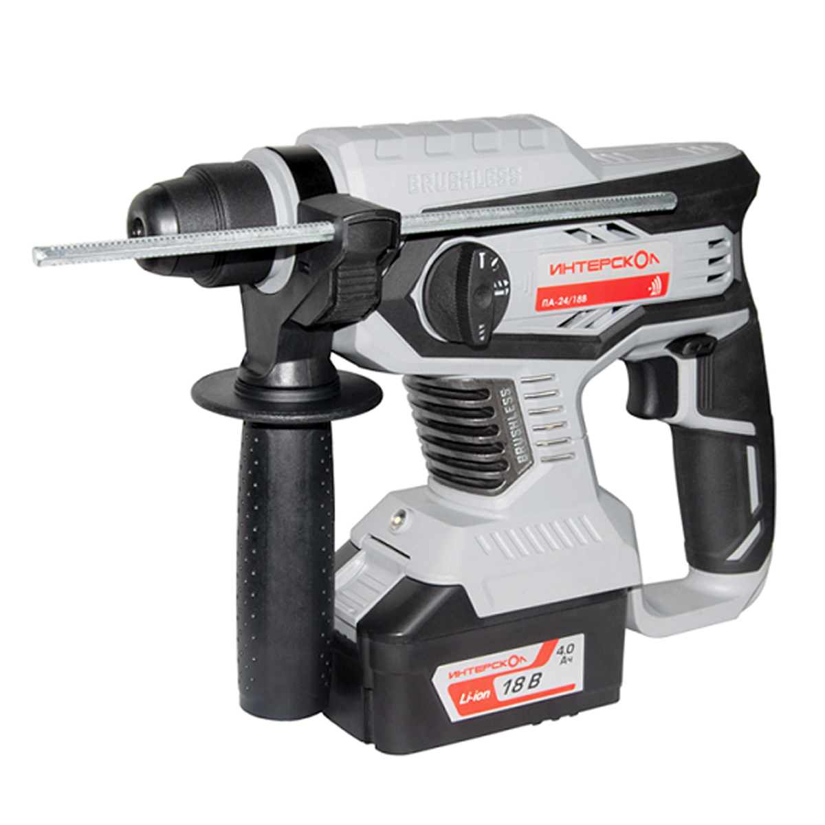 Перфоратор оснащен Li-ion слайдерными аккумуляторным блоком платформы АПИ ИНТЕРСКОЛ.