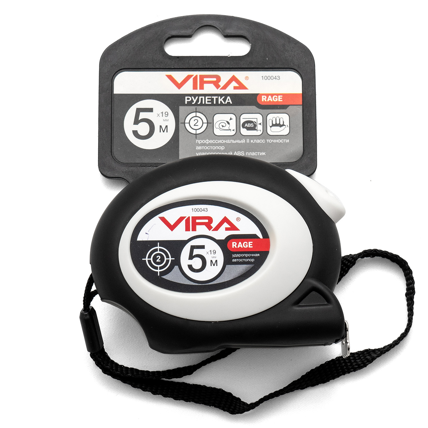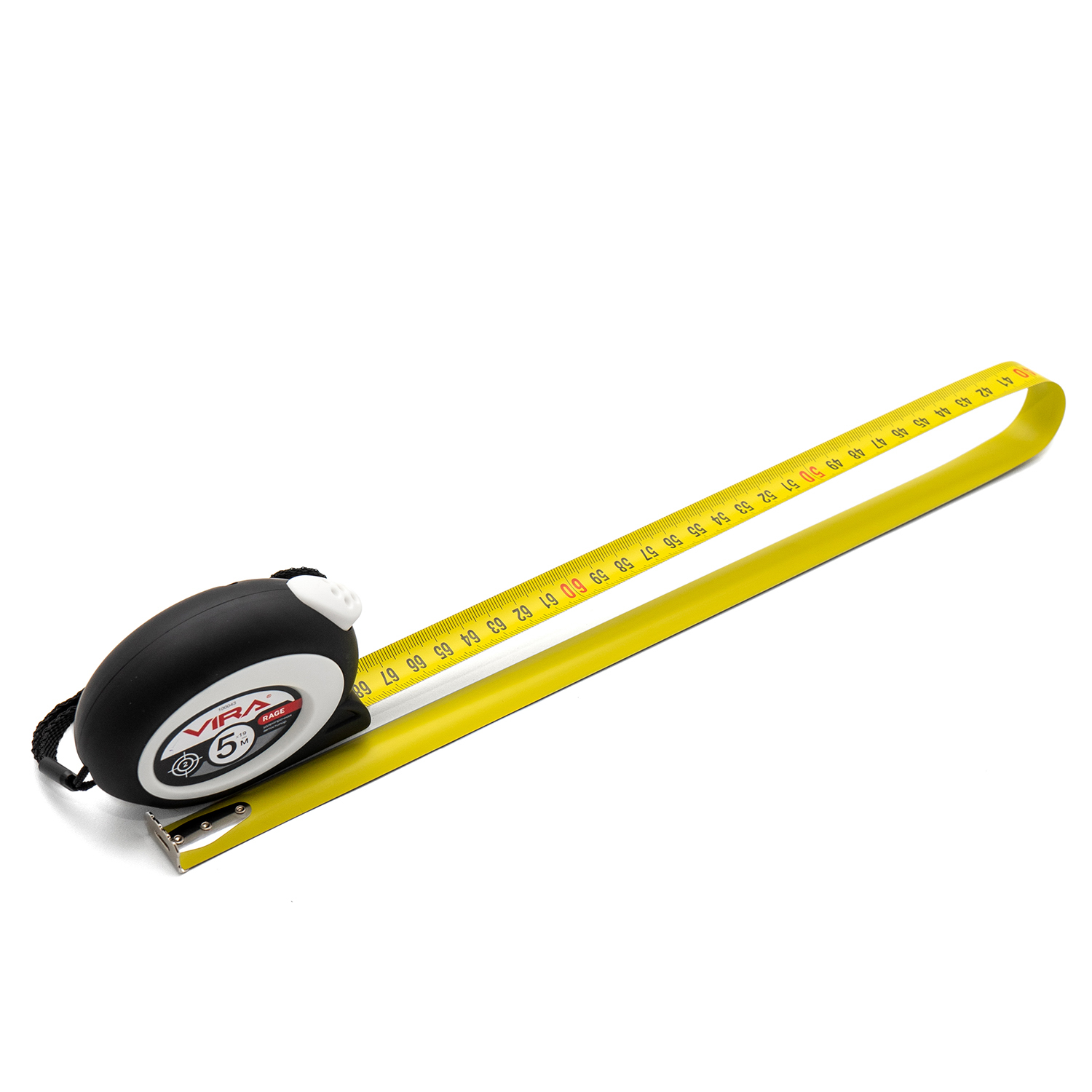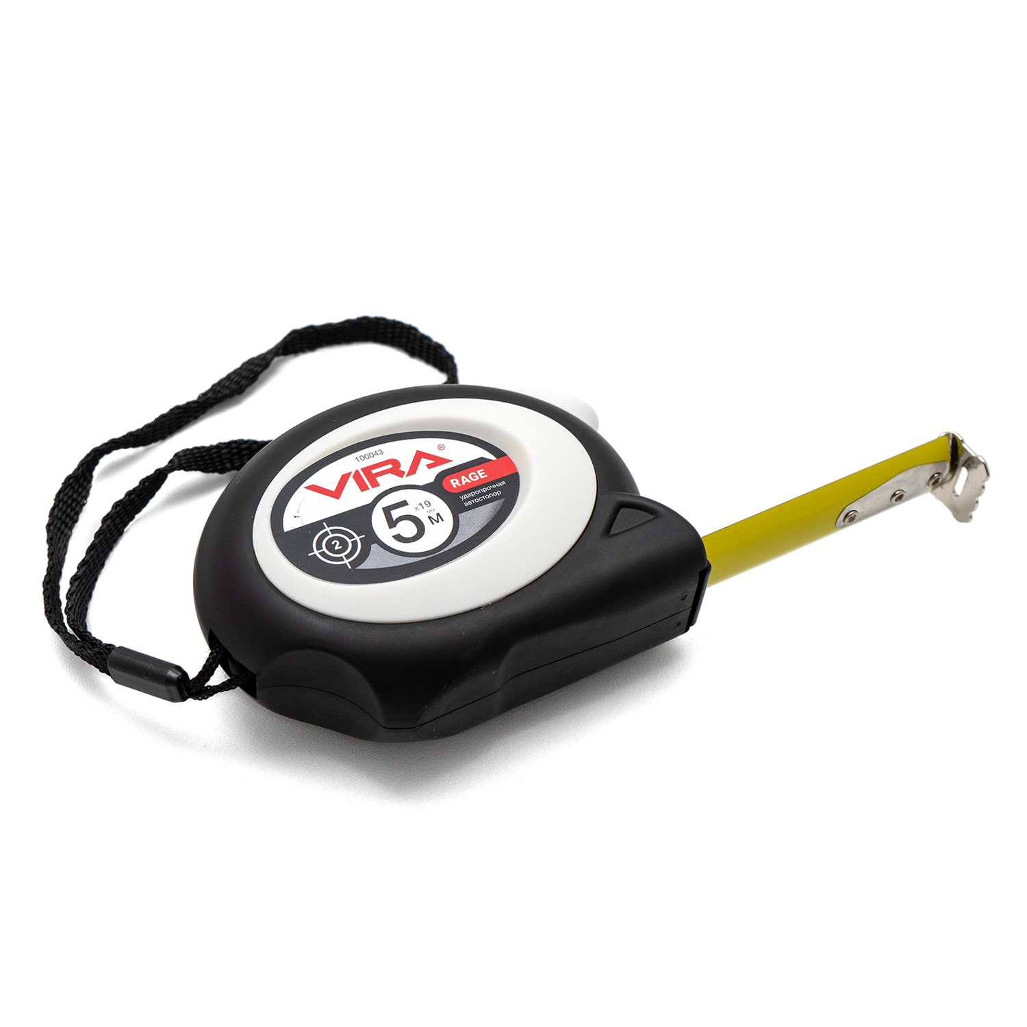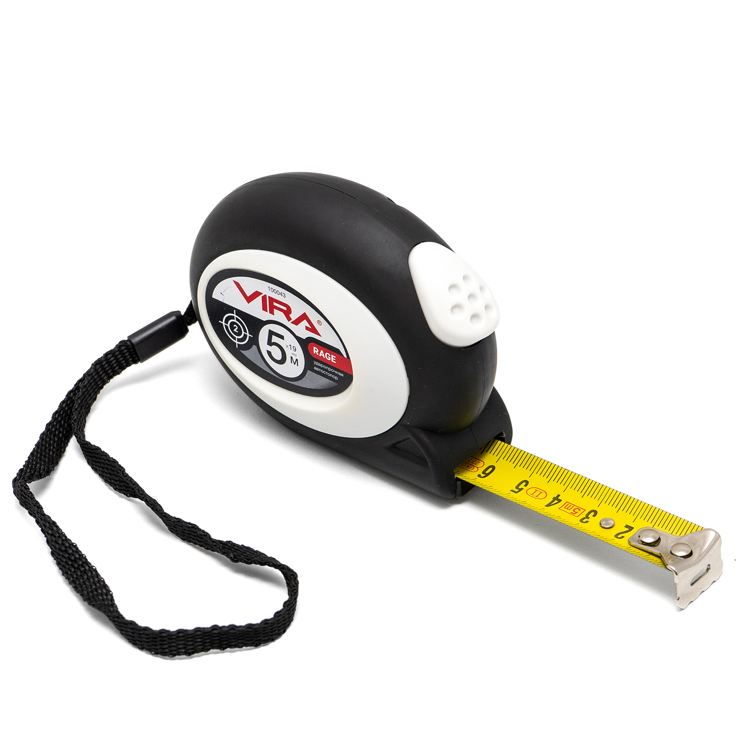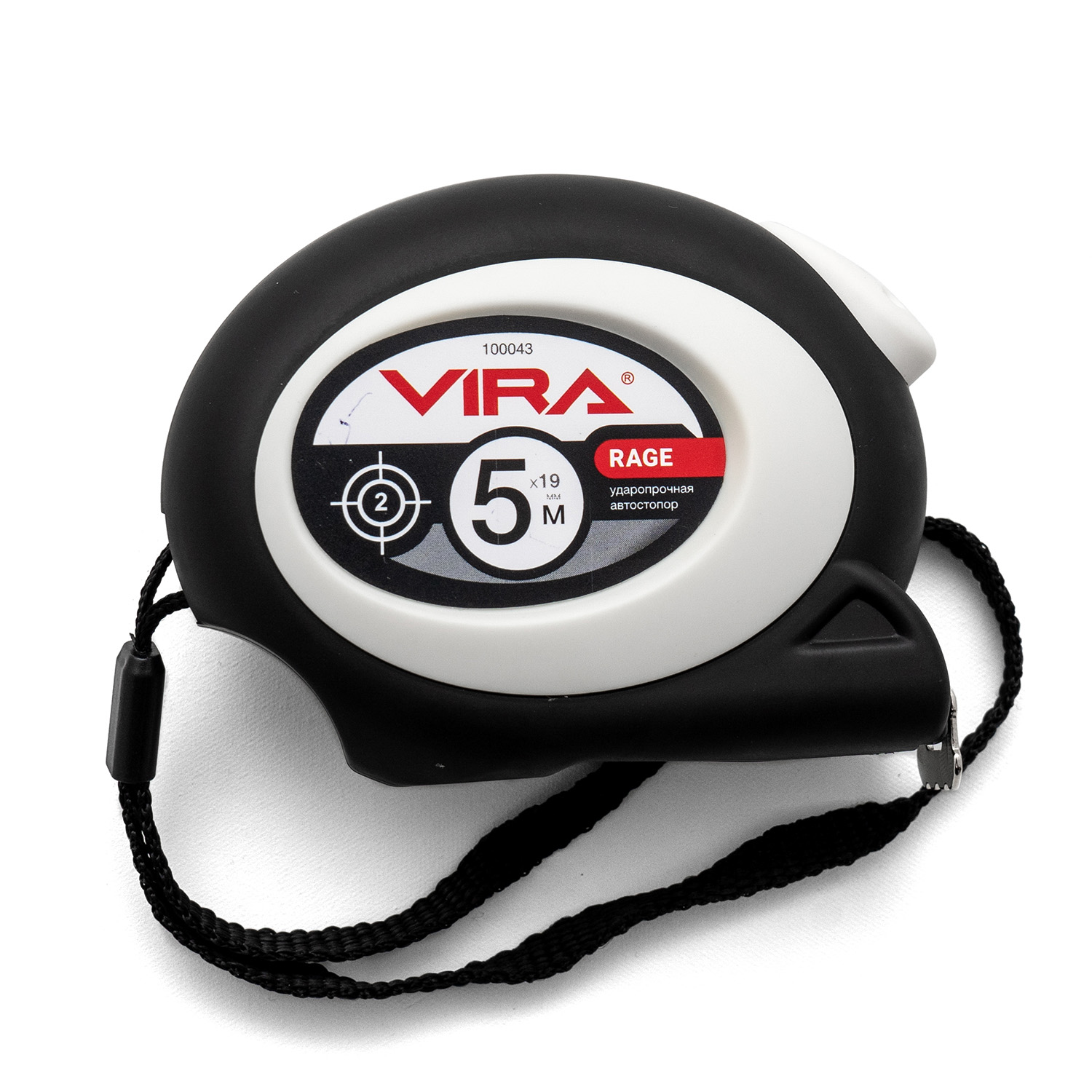 Рулетка RAGE by VIRA 5м х 19мм, с автоматическим стопором. Длина ленты 5 метров. Ширина измерительного полотна 19 мм. Автоматический стопор освобождает от случайного сматывания рулетки – Вы концентрируетесь только на работе и не удерживаете никаких кнопок, чтобы фиксировать ленту. Чтобы собрать полотно, достаточно нажать на кнопку, удобно расположенную на рулетке, прямо под большим пальцем вашей руки. Увеличенная толщина полотна дает возможность работать с инструментом на ограниченной длине без посторонней помощи – лента не будет изламываться. Лента состоит из трех слоев: стальная основа, вторичное покрытие и защитный слой. Благодаря овальной форме рулетка приятно обхватывается кистью руки. Корпус из ударопрочного ABS пластика выдерживает падение с высоты до 5 метров. Дополнительное обрезиненное покрытие не даст рулетке выскользнуть из ладони. Разметка на ленте нанесена в соответствии со вторым (II) классом точности. Погрешность ±1.3мм. Плавный ход ленты при разматывании и сматывании обеспечивается пружиной из высокопрочной стали MN65. Рулетку удобно носить за тканевый ремешок или прикреплять к поясу за жесткое металлическое крепление.