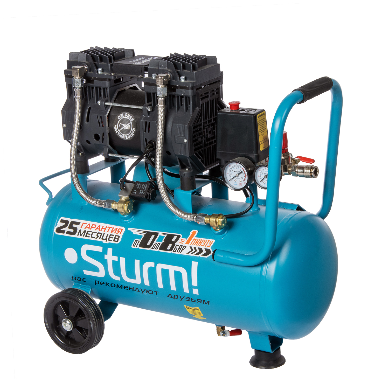 Безмасляный компрессор с 2-х цилиндровым мотором с пониженным уровнем шума, с увеличенным количеством оборотов 2600 об/мин, с двумя шлангами для нагнетания давления обеспечивает поднятие давления в 24-х литровом ресивере с 0 до 8 атмосфер за 1 минуту;