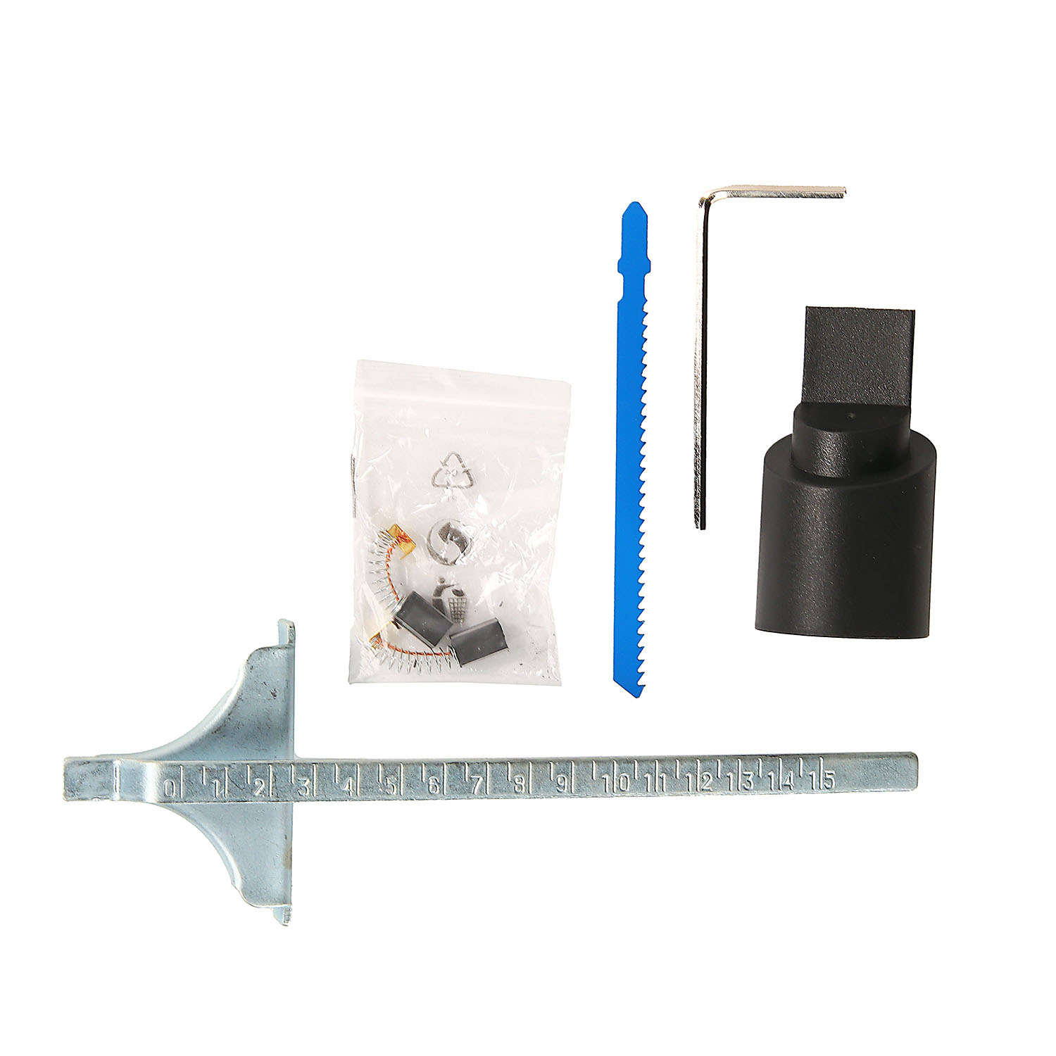 Комплектация : Электролобзик, параллельная направляющая, шестигранный ключ, комплект запасных щеток, пильное полотно, инструкция по эксплуатации.