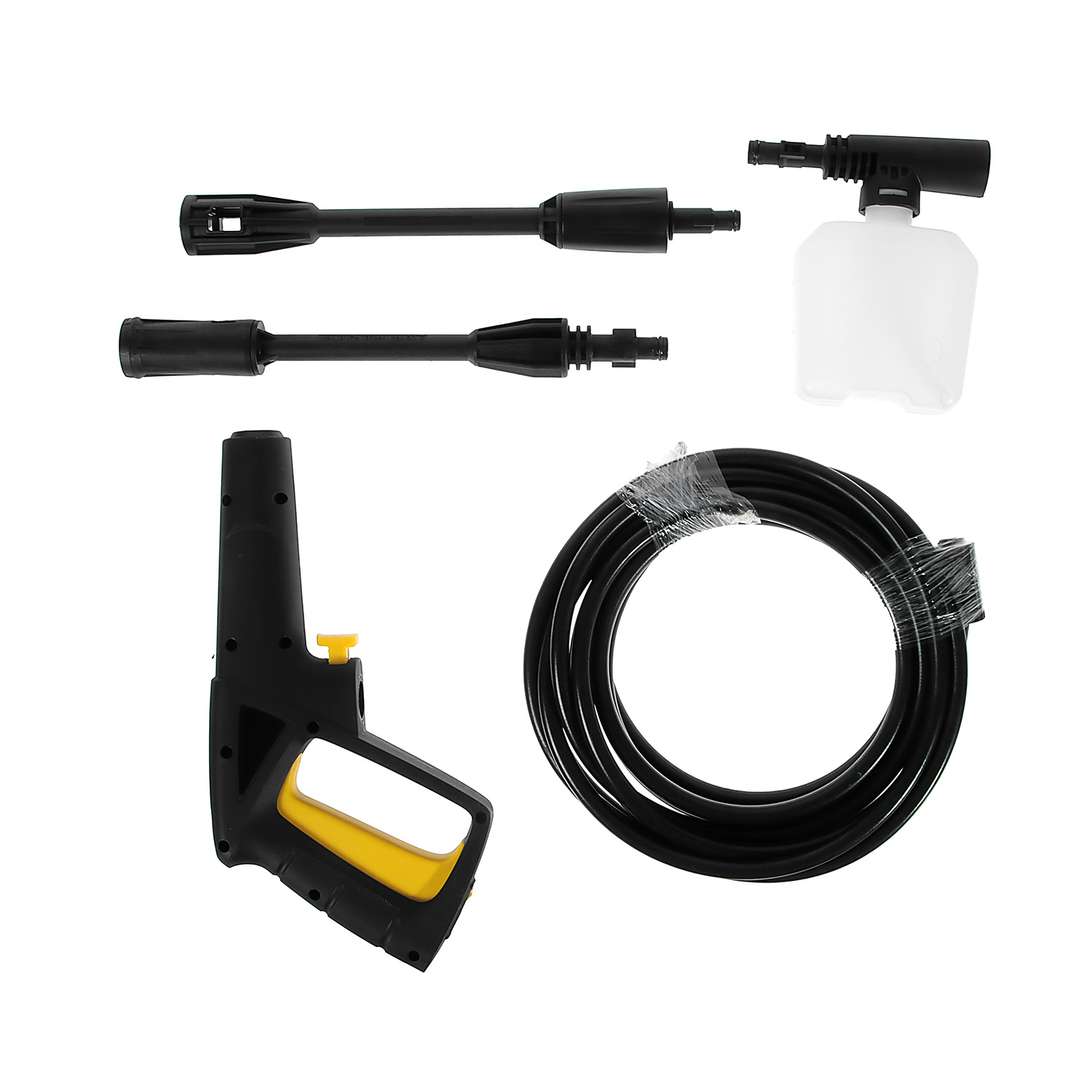 В комплекте Пистолет высокого давления, удлинитель, распылитель, емкость для моющих средств, переходник, быстросъем для шланга 3/4, гибкий шланг высокого давления, игла для очистки сопла.