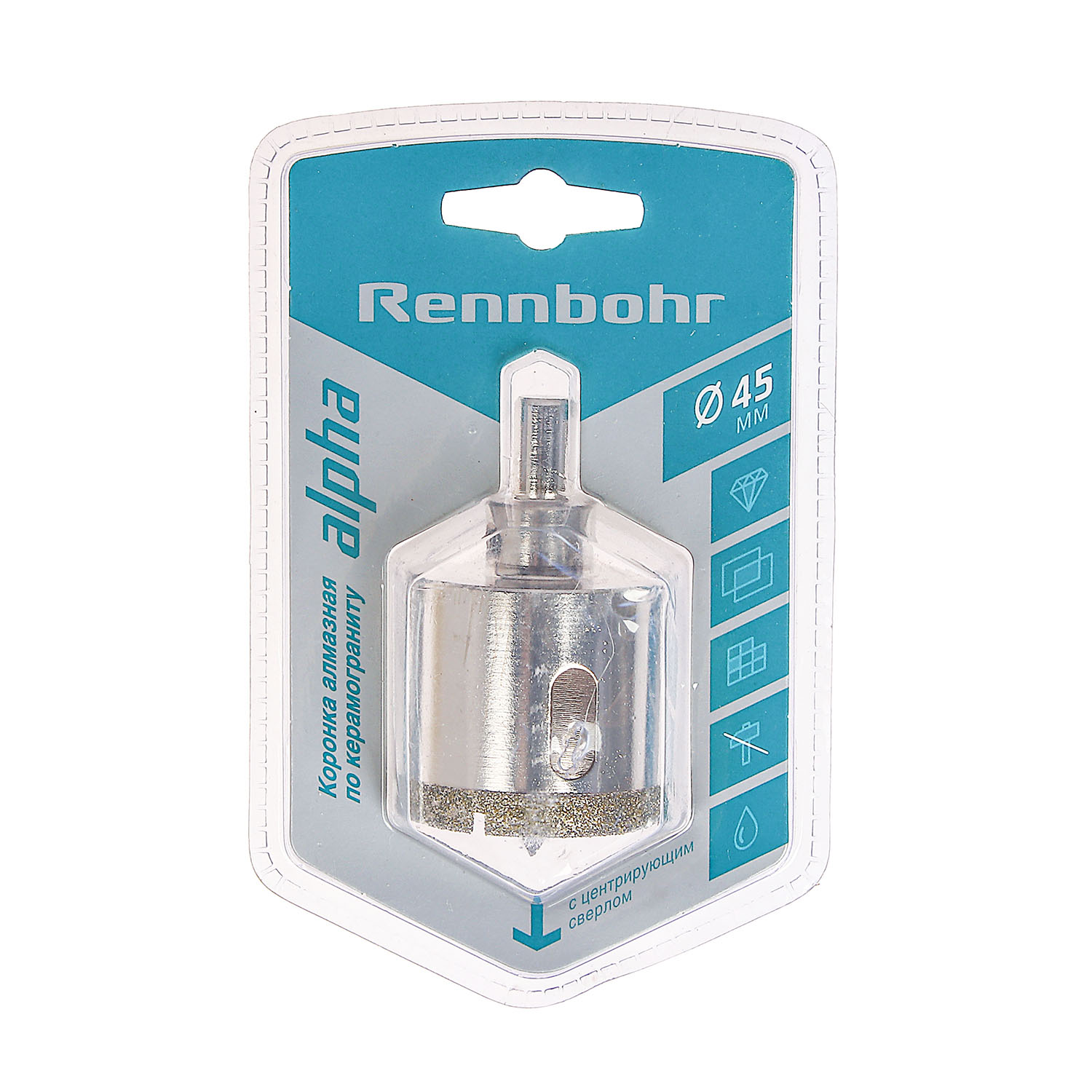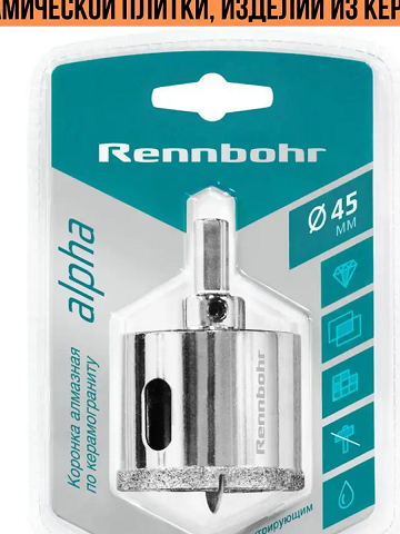 Коронка алмазная с центрирующим сверлом по керамограниту и керамике 45 мм RENNBOHR 676245 предназначена для обработки керамогранита, керамической плитки, изделий из керамики.