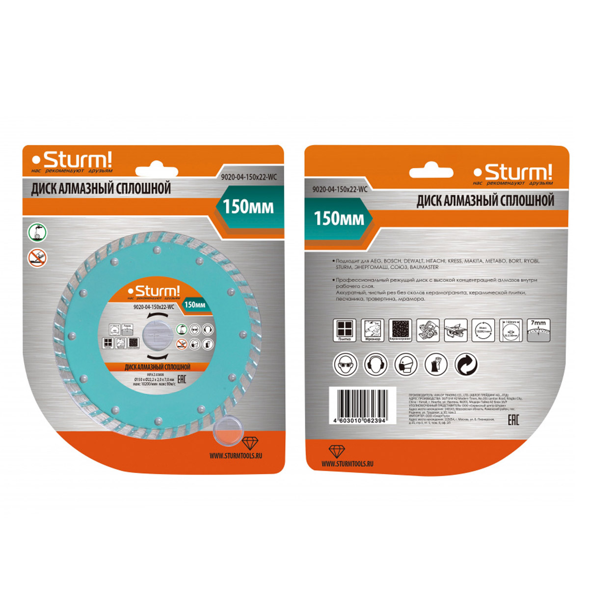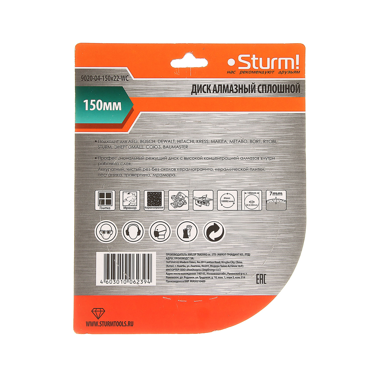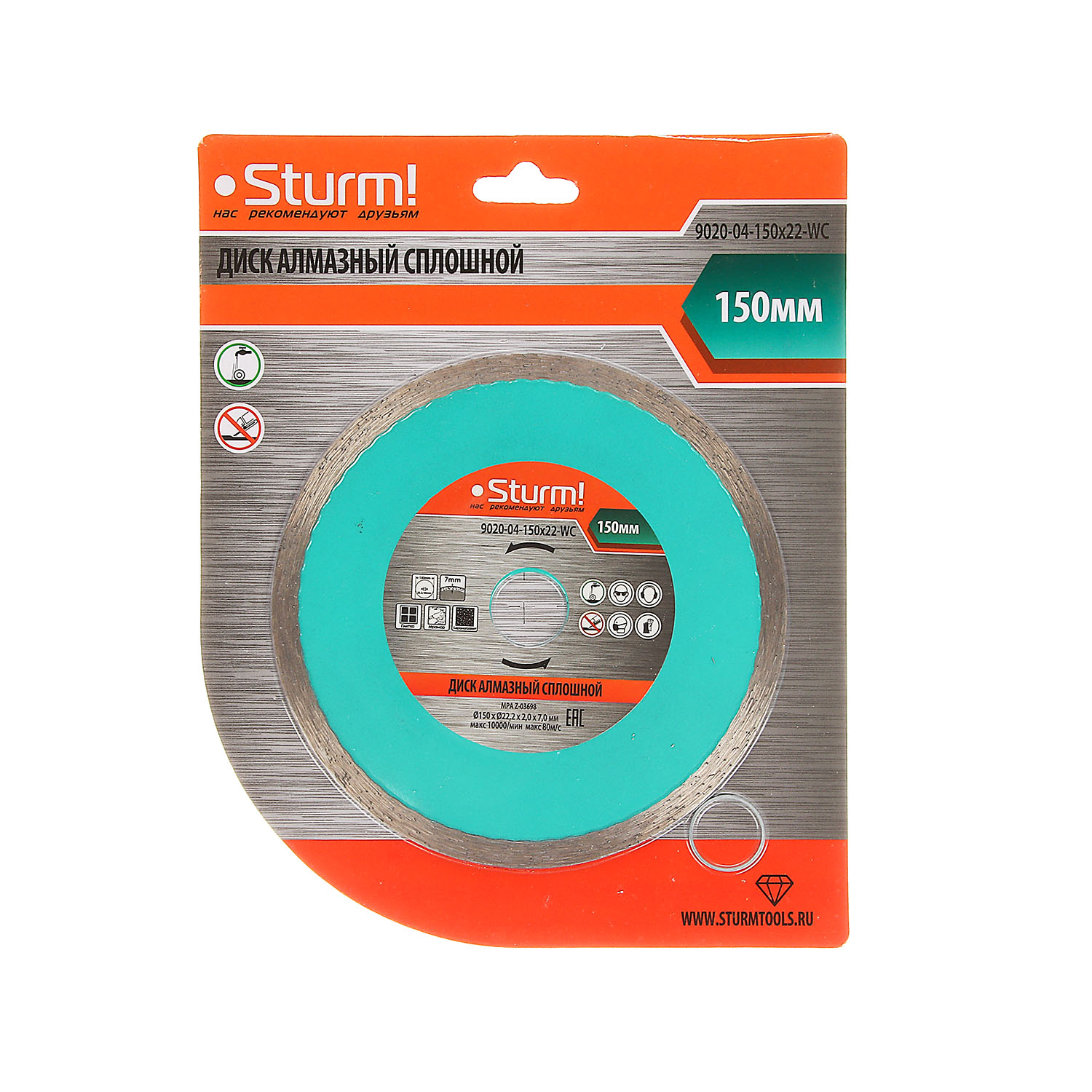 Диск алмазный Sturm! 9020-04-150x22-WC - Режущая кромка с оптимальным содержанием алмазного слоя обеспечивает эффективную работу и низкую износостойкость; аккуратный, ровный рез без сколов; переходное кольцо на 20мм в комплекте
