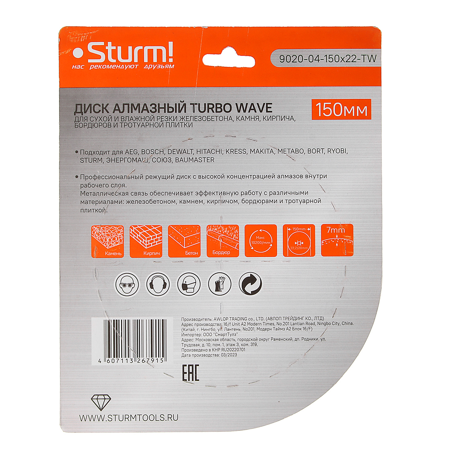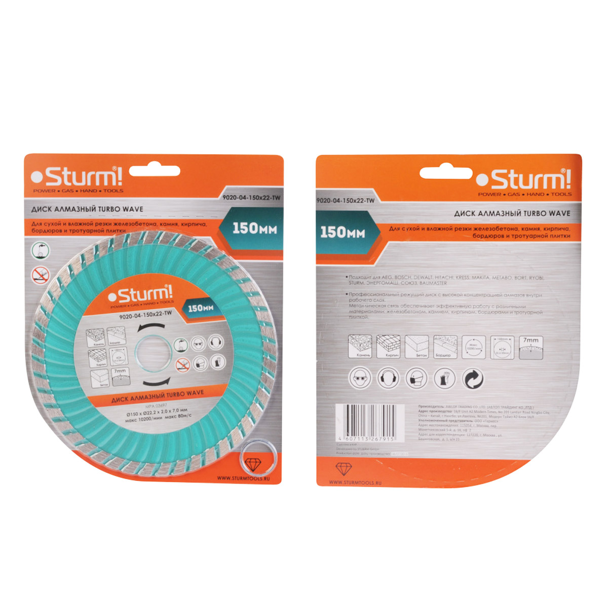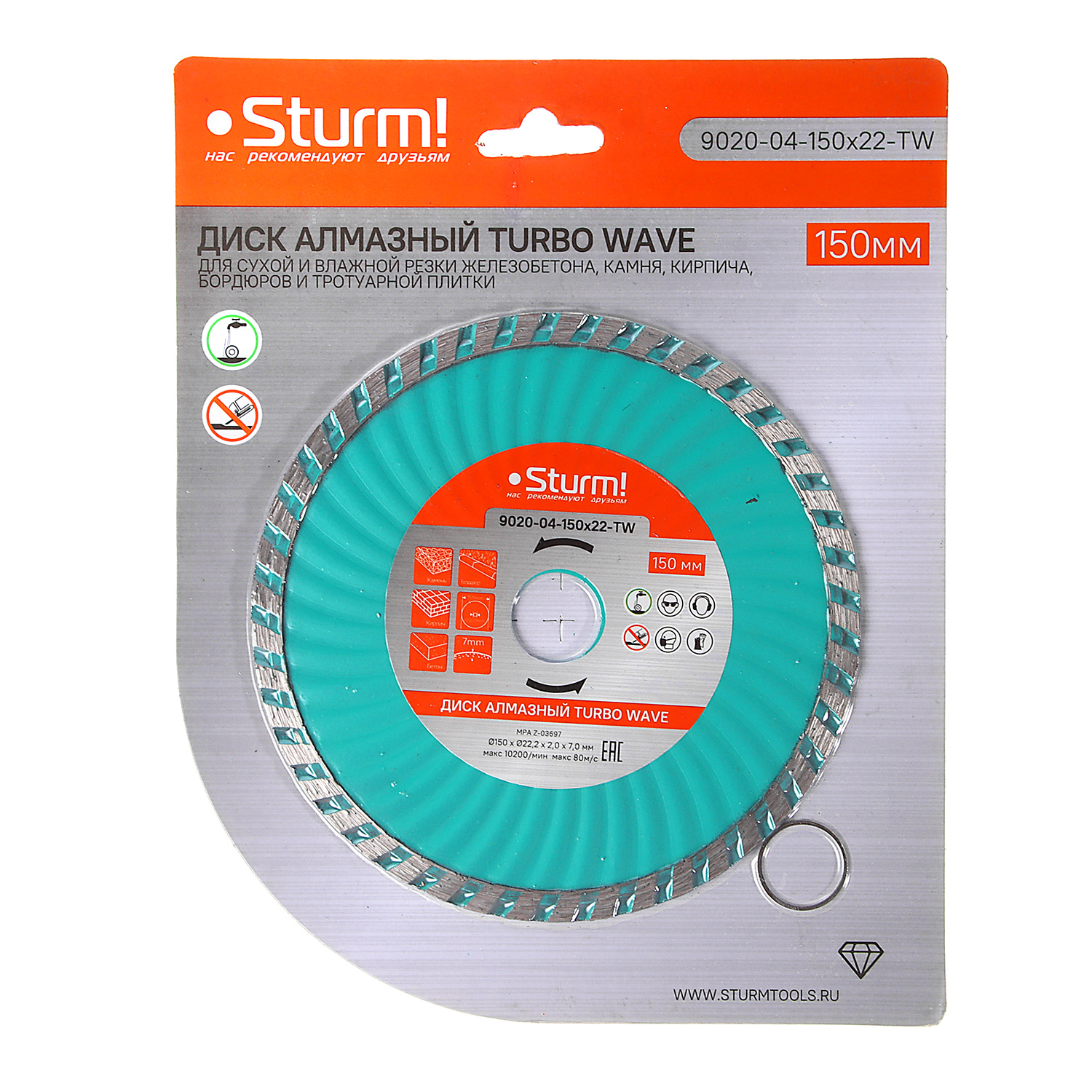 Диск алмазный Turbo wave Sturm 9020-04-150x22-TW предназначен для ручных резчиков и станков. Применяется для мокрого и сухого реза железобетона, камня, кирпича, бордюров и тротуарной плитки.