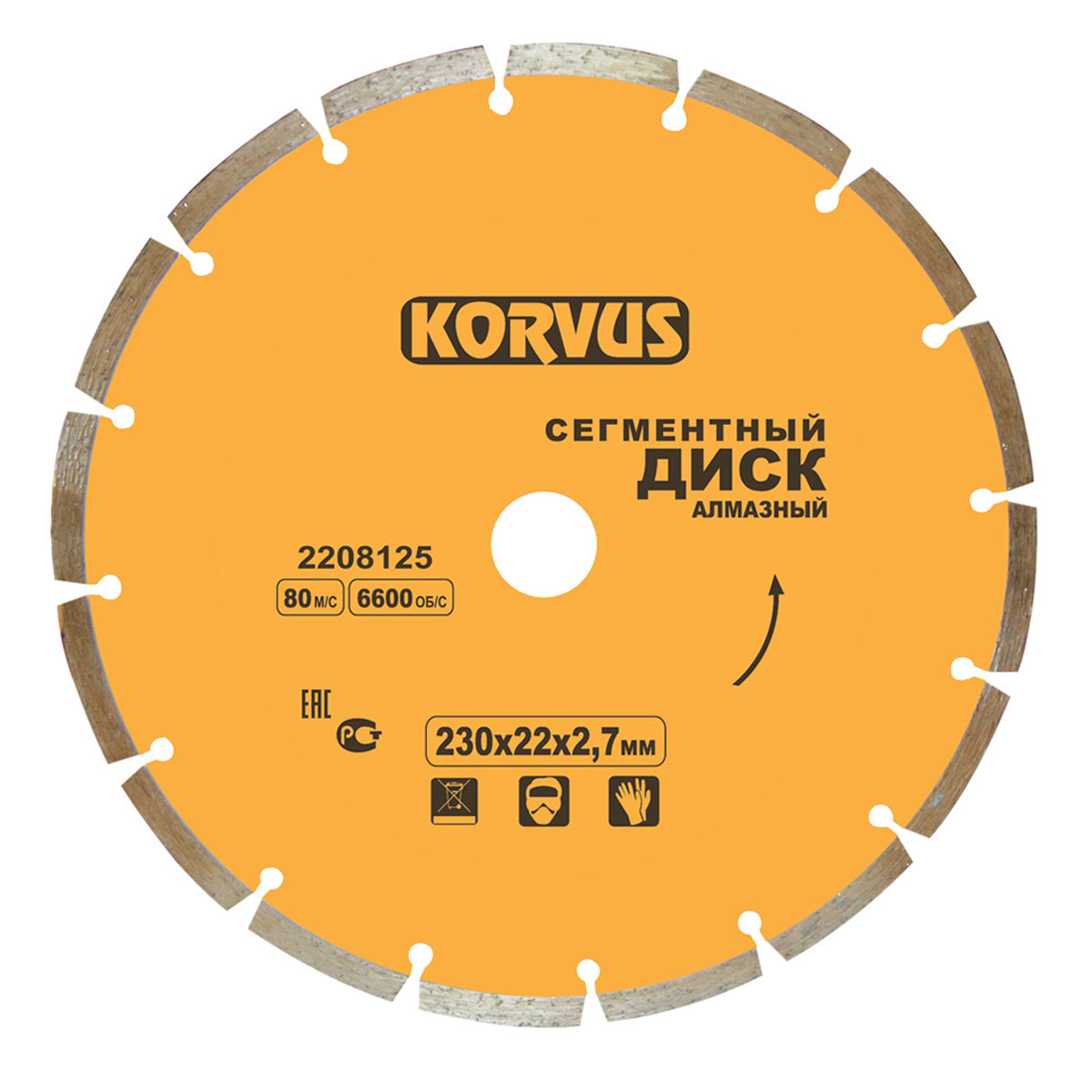 Диск алмазный сегментный 230x2.7x22 мм 2208125 Korvus Лк-00003261 применяется для высокопроизводительного и точного пиления с воздушным охлаждением бетона, природного и искусственного камня, огнеупорного кирпича, мрамора, гранита и иных строительных материалов.