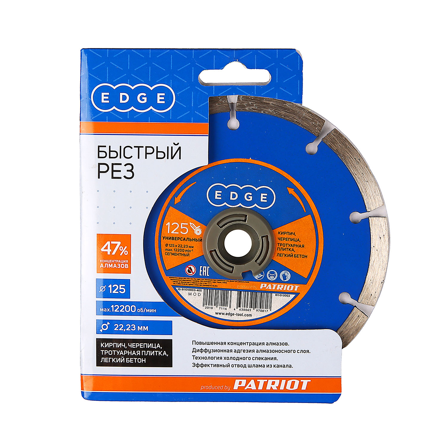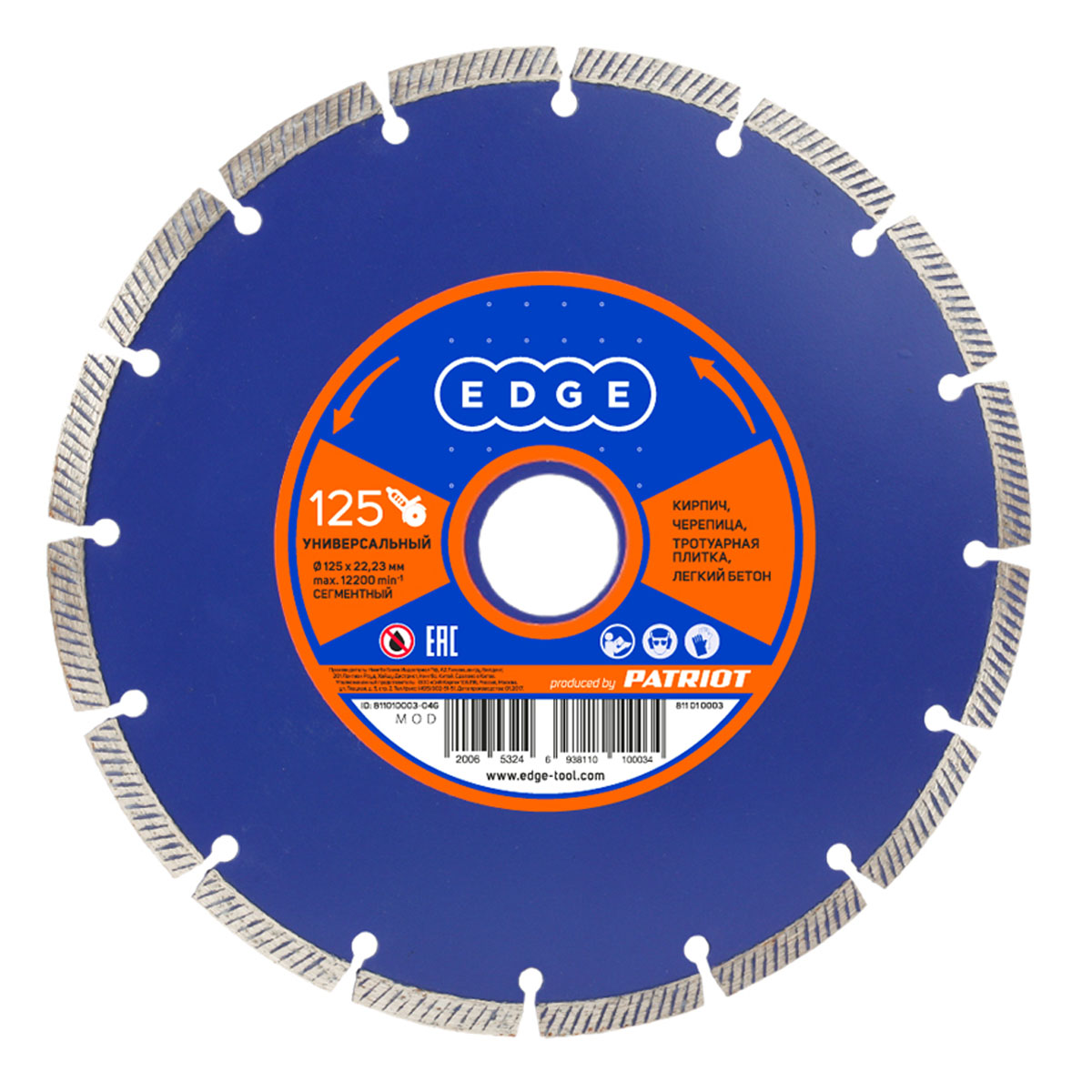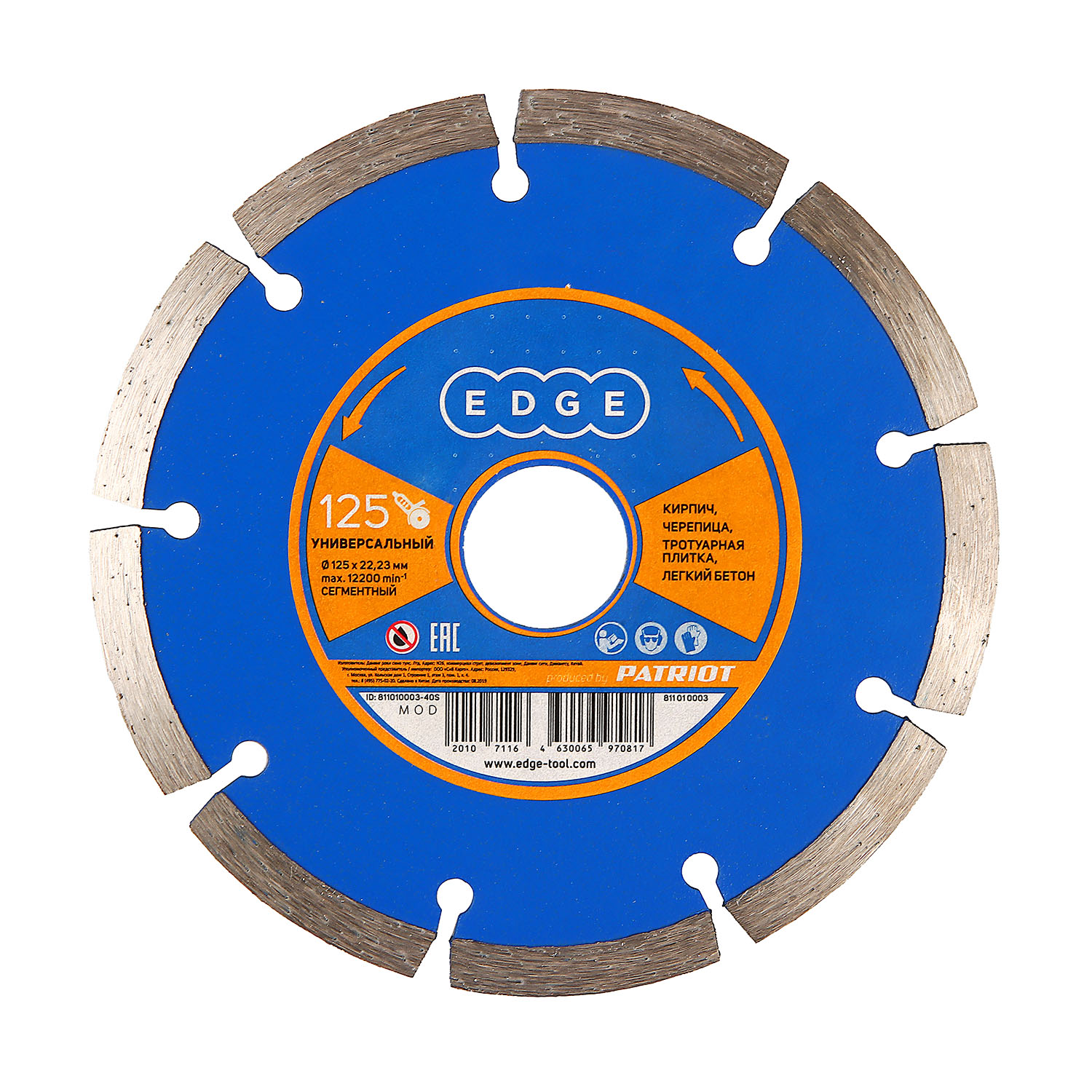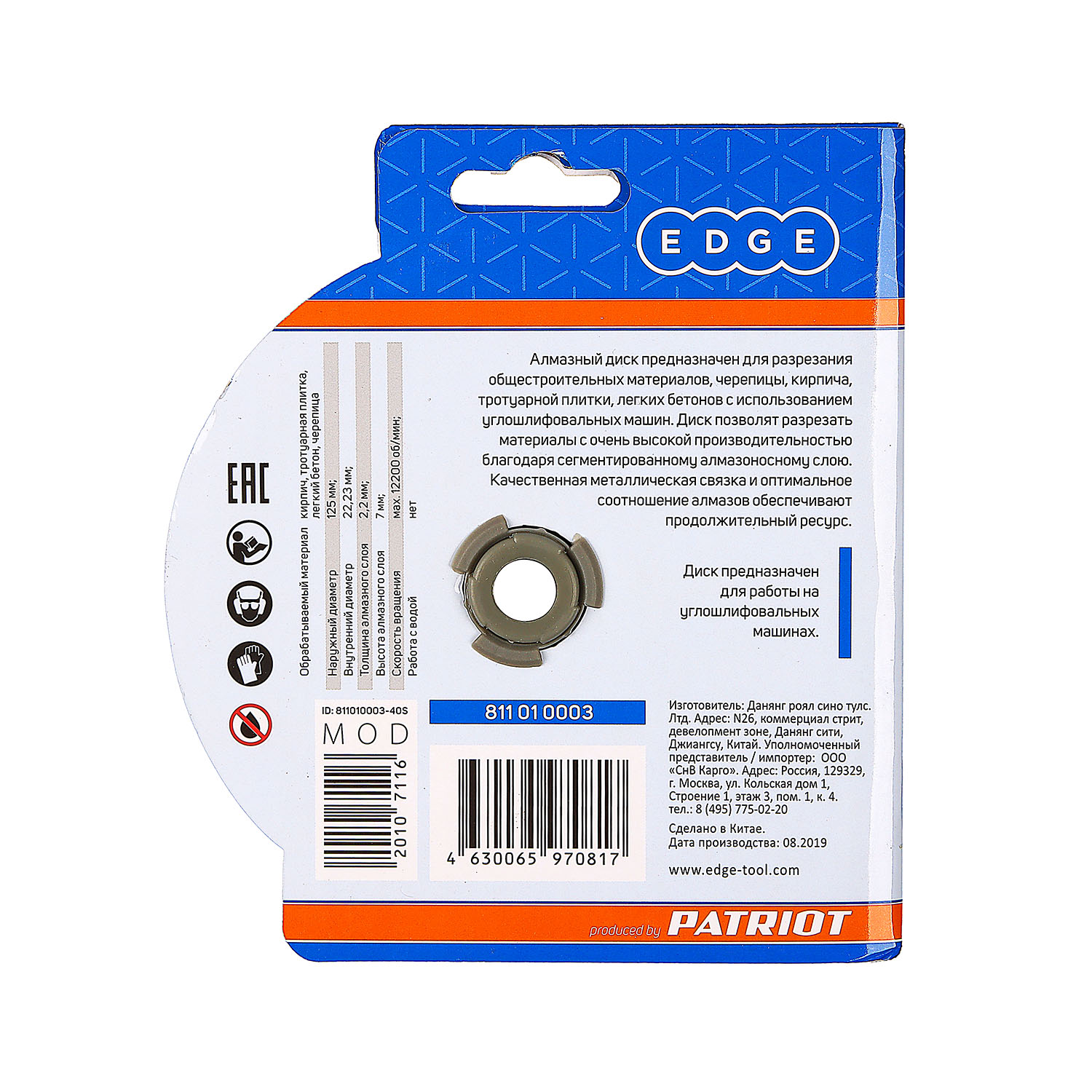Диск алмазный сегментный EDGE by PATRIOT 811010003 предназначен для резки кирпича, черепицы, тротуарной плитки и бетона с помощью угловой шлифовальной машины.