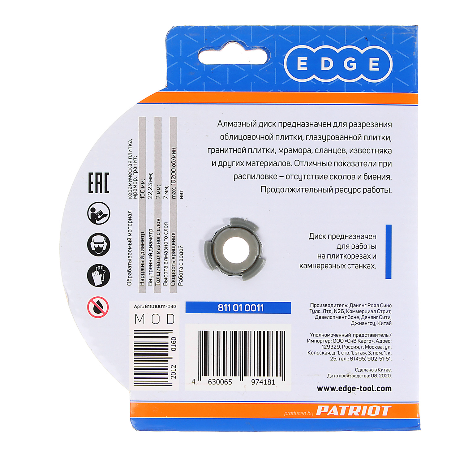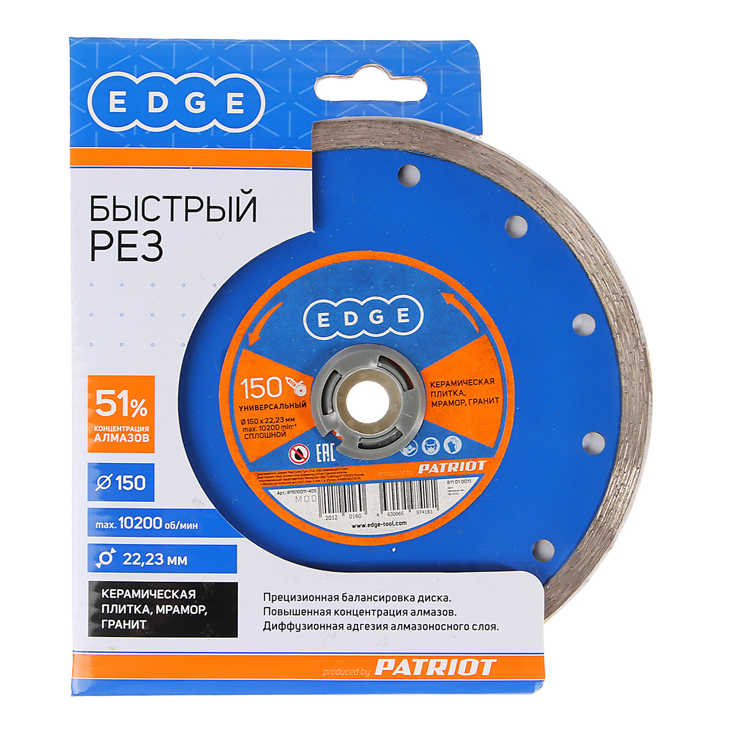 Диск алмазный сплошной PATRIOT 811010011 предназначен для резки керамической плитки, мрамора, гранита с помощью угловой шлифовальной машины.