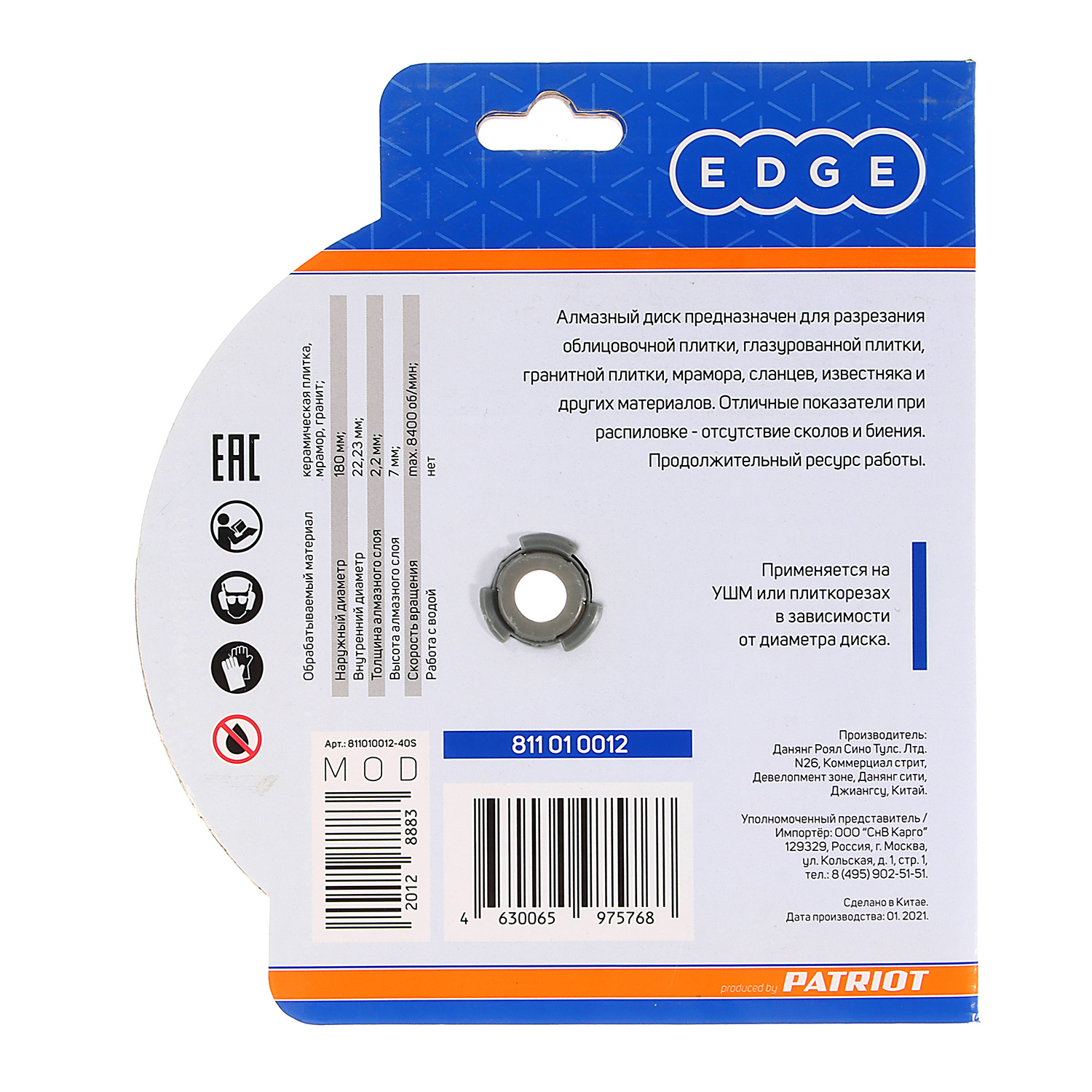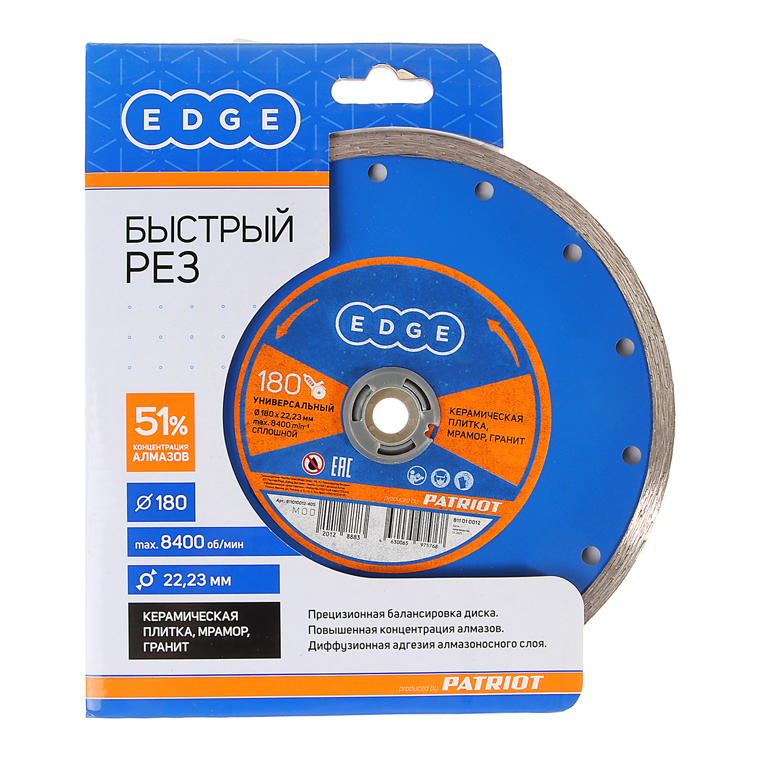 Диск алмазный сплошной PATRIOT 811010012 предназначен для резки керамической плитки, мрамора, гранита с помощью угловой шлифовальной машины. Имеет повышенную концентрацию алмазов, что увеличивает производительность и срок службы оснастки.