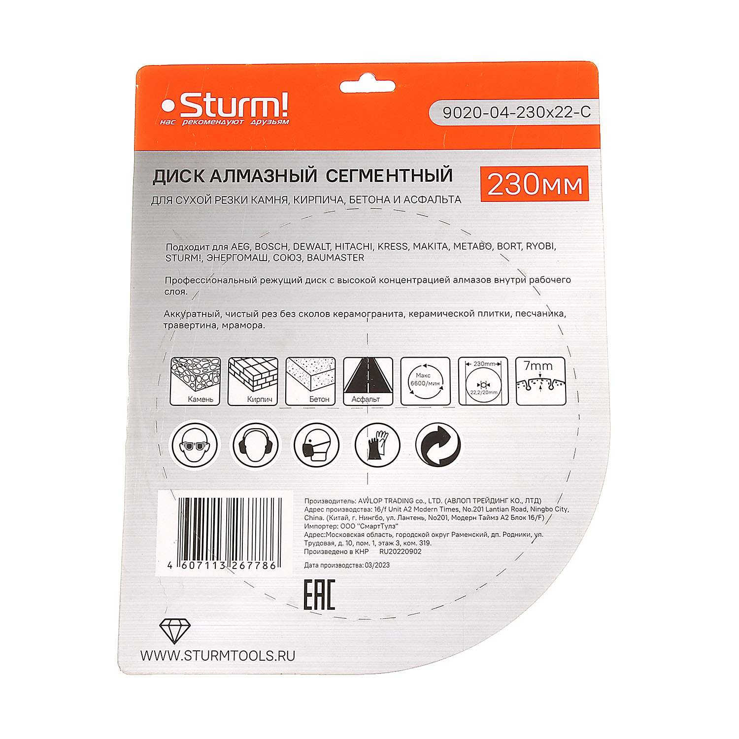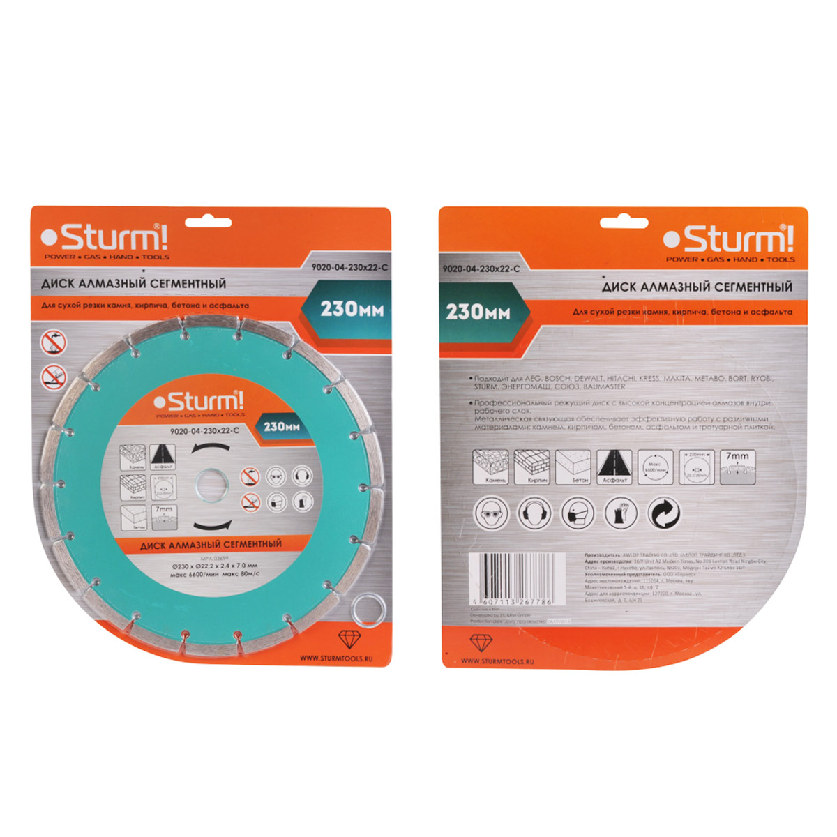 Диск алмазный сегментный Sturm 9020-04-230x22-C предназначен для ручных резчиков и станков. Применяется для сухого реза по камню, кирпичу, бетону и асфальту.
