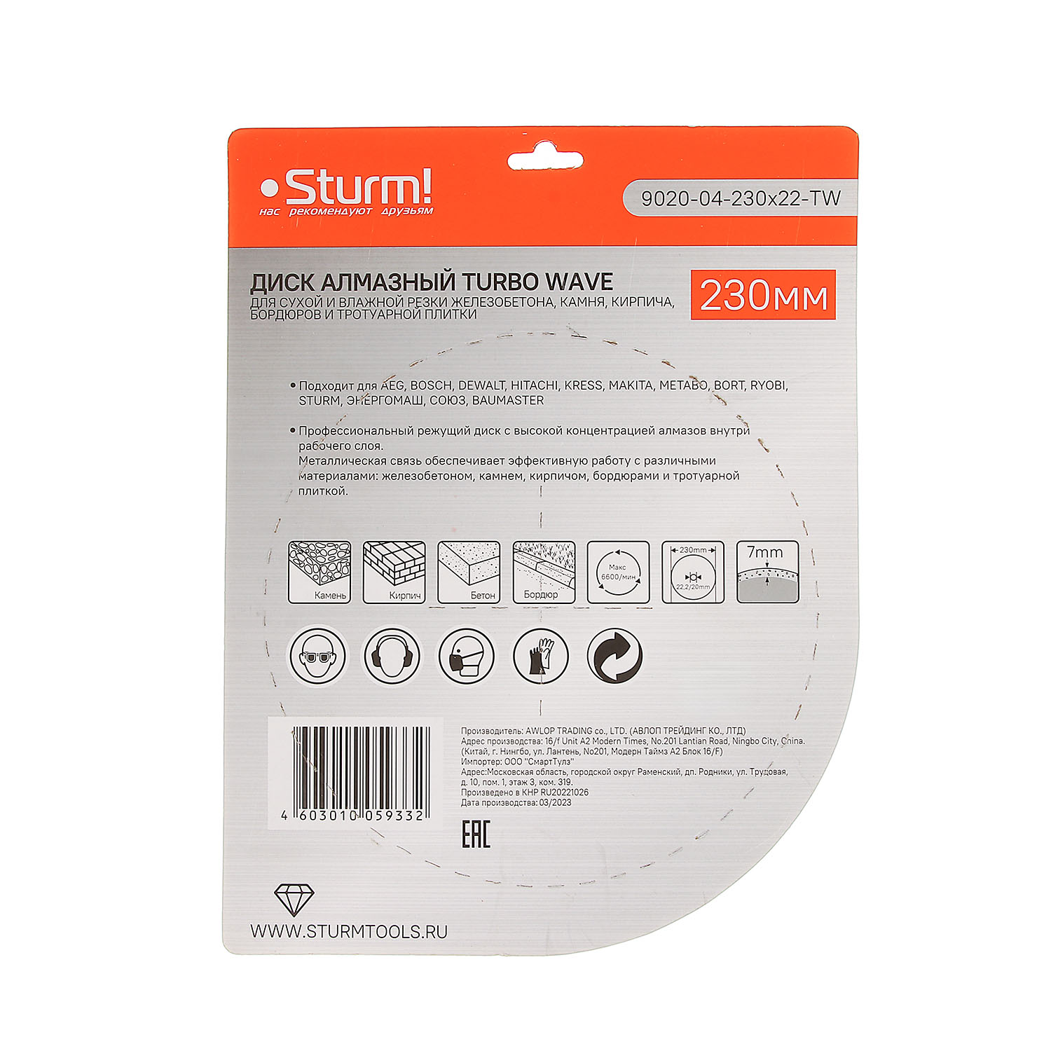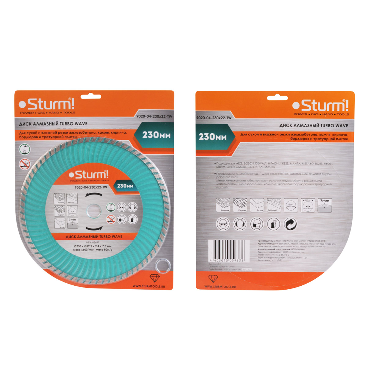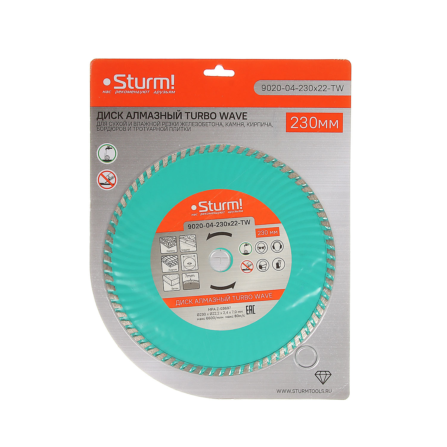 Диск алмазный Turbo Sturm 9020-04-230x22-TW предназначен для ручных резчиков и станков. Применяется для мокрого и сухого реза железобетона, камня, кирпича, бордюров и тротуарной плитки.
