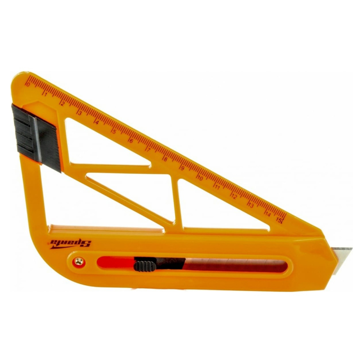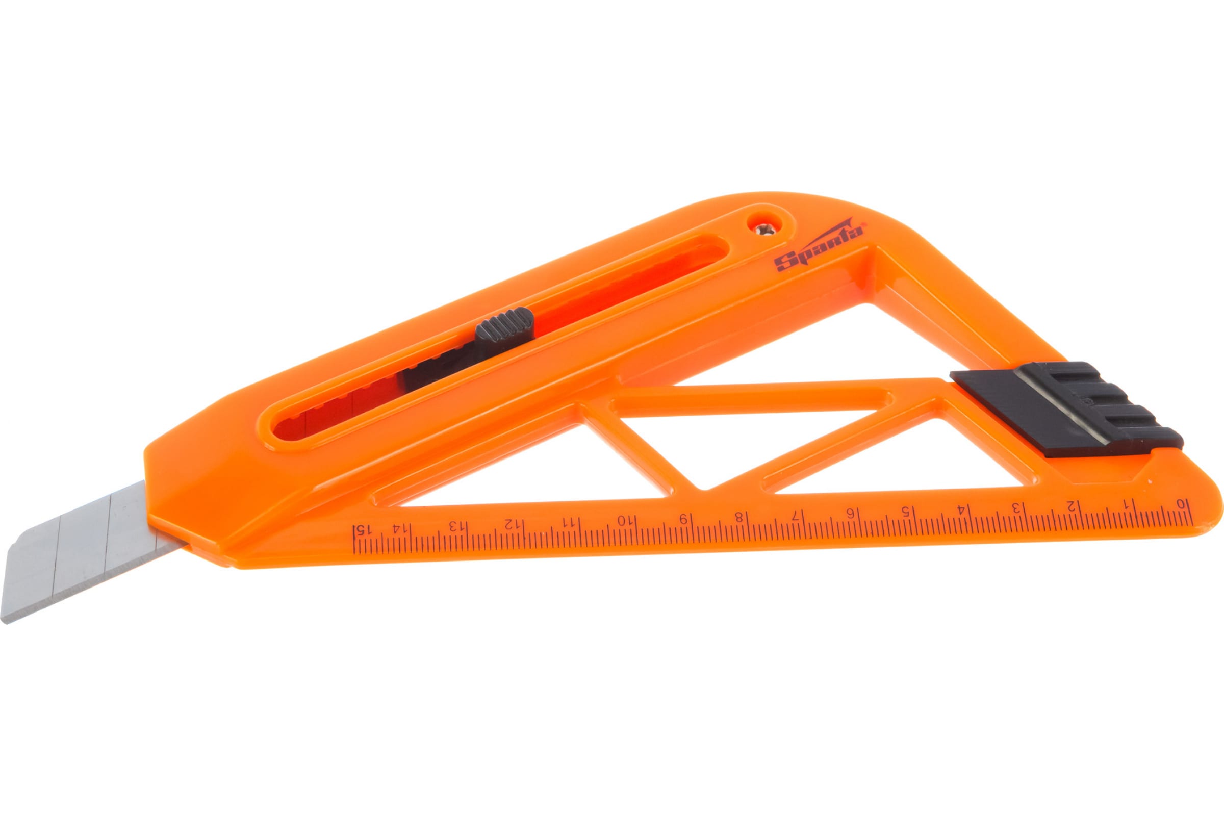 Нож с выдвижным лезвием и линейкой 18 мм SPARTA 789195 имеет пластмассовый корпус специальной формы с нанесенной миллиметровой шкалой, обеспечивающей разрез на нужную длину.