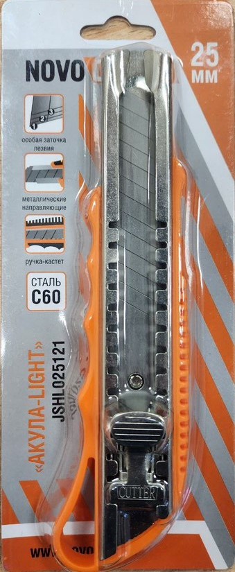 Нож NOVOCRAFT AКУЛА-light 25 мм, JSHL025121 используется для разрезания обоев, картона, линолеума и других материалов. Пластиковая рукоятка не выскальзывает во время работы, что обеспечивает комфорт в эксплуатации.