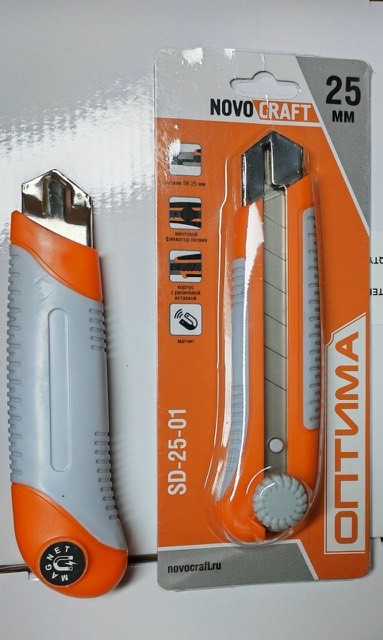 Нож NOVOCRAFT АКУЛА, 25 мм, резиновый корпус блистер JSH025251 используется для разрезания обоев, картона, линолеума и других материалов.