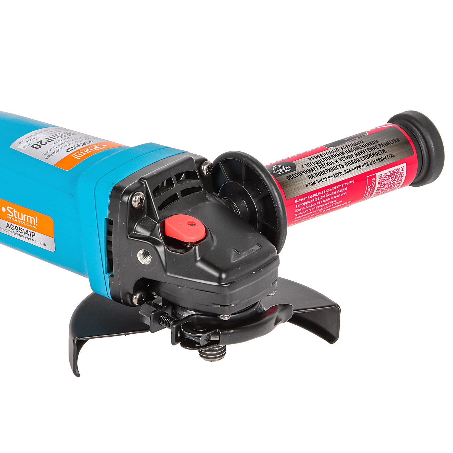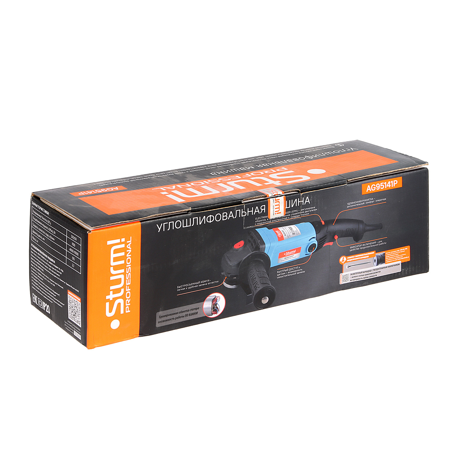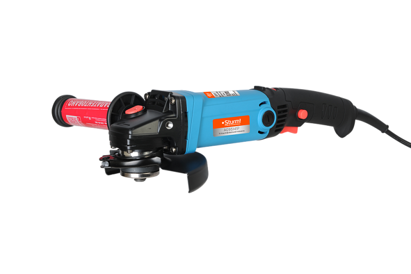Sturm AG95141P – мощная универсальная болгарка (УШМ) профессиональной серии инструмента Sturm под рабочий диаметр диска 125 мм. Имеет компоновку с длинной рукоятью, за счет чего максимально удобна при зачистных и шлифовочных операциях. Выверенные массово-габаритные показатели, а также нейтральный центр тяжести обеспечивают лучший контроль инструмента, а клиновидный корпус редуктора позволяет работать даже в условиях с трудным доступом. Главная особенность модели, выделяющая ее среди аналогов – наличие блока константной электроники который гарантирует поддержание стабильной частоты вращения на валу шпинделя, препятствуя падению оборотов под нагрузкой. Кроме того, Sturm AG95141P оснащена системой плавного пуска, снижающей величину пускового тока и исключающей стартовый рывок, а также электронной регулировкой оборотов (4000 – 10000 об / мин), благодаря которой достигается оптимальный подбор частоты вращения в зависимости от типа используемой оснастки и обрабатываемого материала. Модель имеет повышенные надежность и ресурс, как за счет применения качественных комплектующих ( японские фирменные подшипники NSK), так и благодаря продуманной, с запасом по прочности, конструкции : электромотор покрыт несколькими изоляционными слоями термостойкого лака и имеет дополнительную защиту от пыли и абразивных частиц, благодаря закалке, повышенной износостойкостью обладают шестерни редуктора, в качестве опор вала шпинделя установлены шарикоподшипники, корпус инструмента изготовлен с использованием нейлона, что способствует его долговечности. Модель проста в эксплуатации и обслуживании. Снабжена быстросъемным защитным кожухом, надежно фиксирующимся при помощи специального зажимного рычага, а также удобной обрезиненной патентованной рукоятью с твердосплавным разметочным карандашом внутри. Предусмотрена возможность быстрого доступа к щеткам, упрощающая процесс их замены, так как исключает демонтаж элементов корпуса.