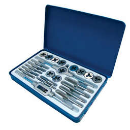 Включает метчики и плашки для нарезания популярных размеров метрических резьб. Укомплектован воротками для метчиков и плашек.