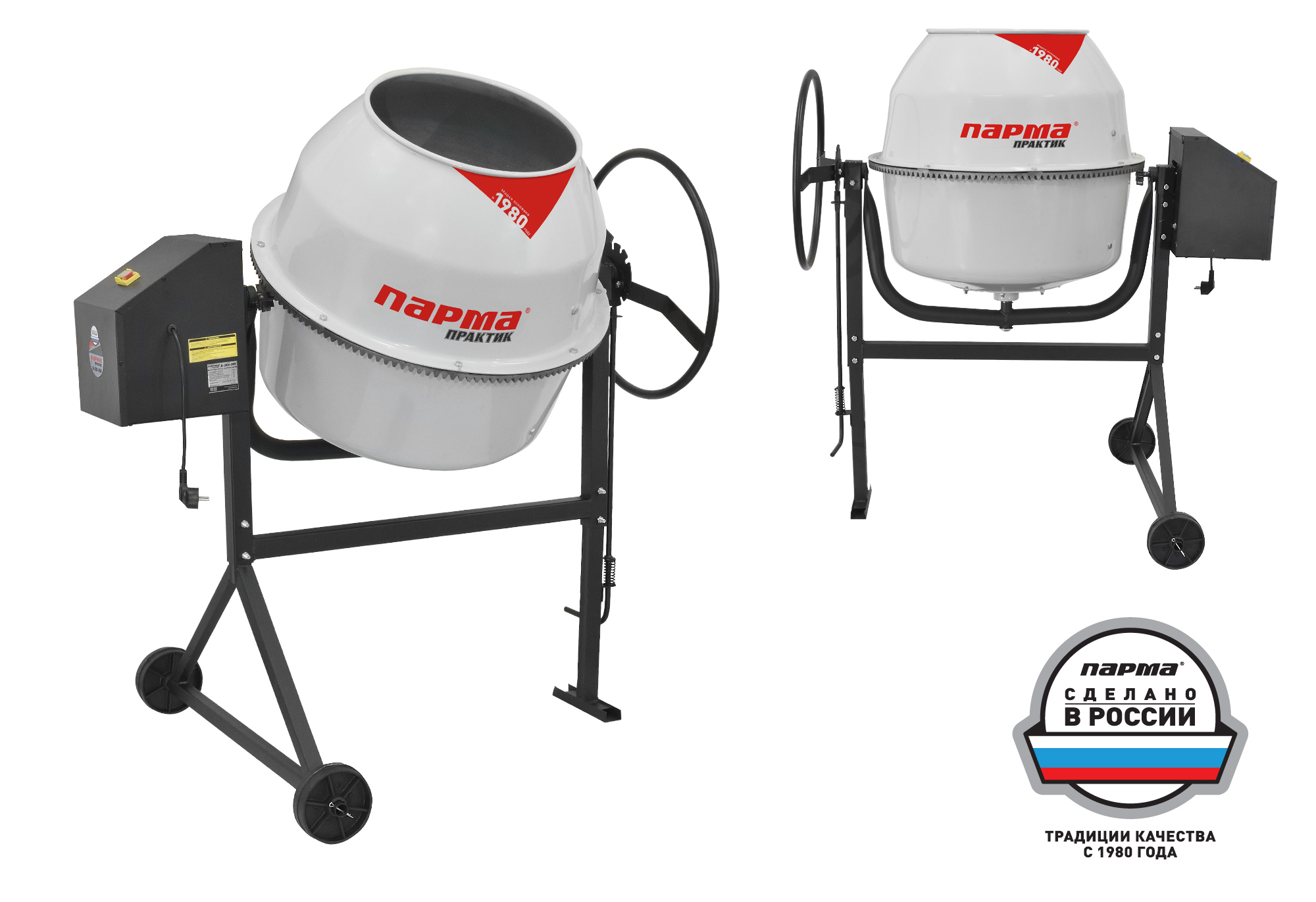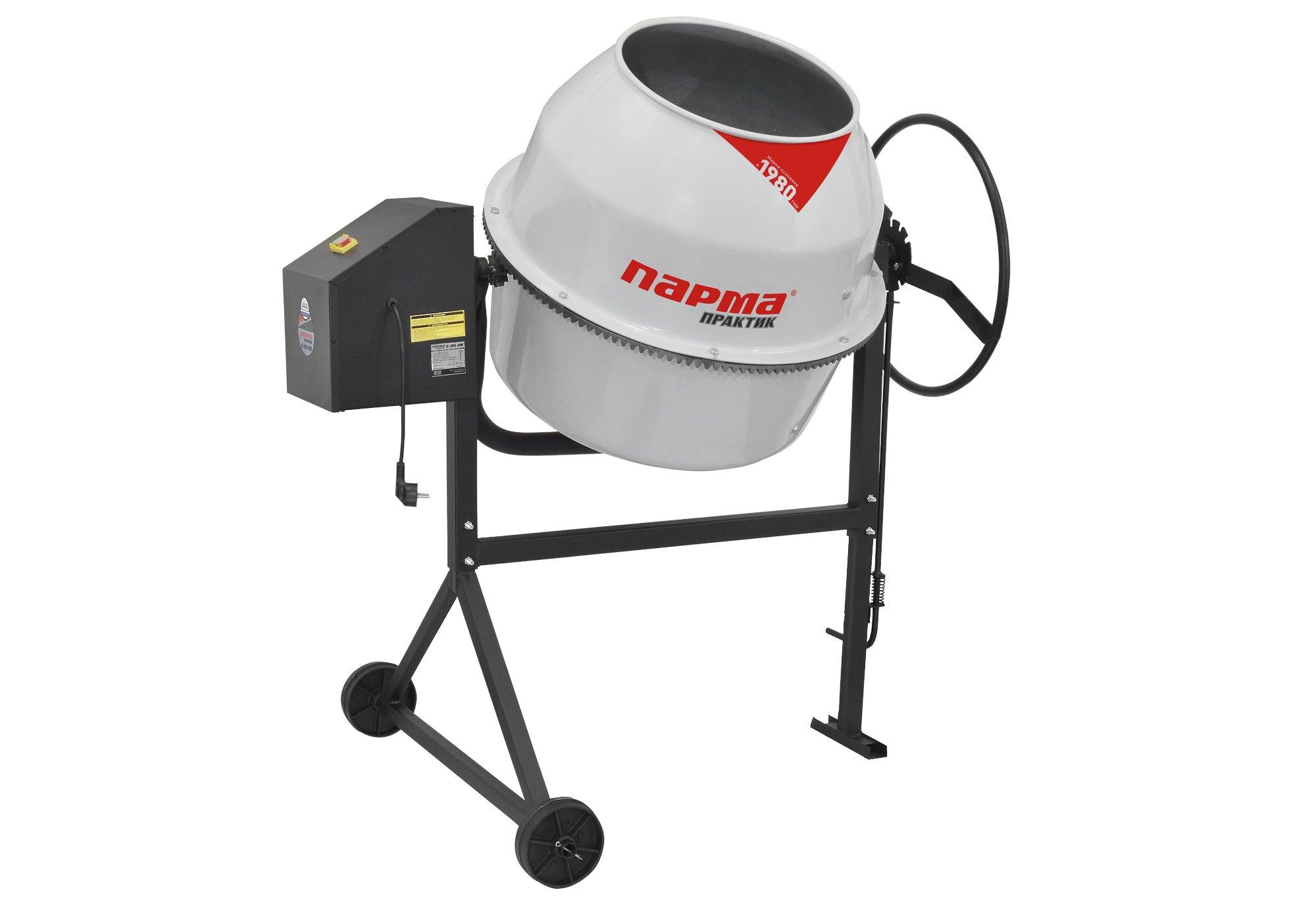 Объем бака 200л, объем готовой смеси 85л, номин.мощн 600Вт, материал венца чугун.Компактный корпус двигателя.Ножной механизм фиксации положения емкостей.Порошковая окраска.Прочные транспортировочные колеса