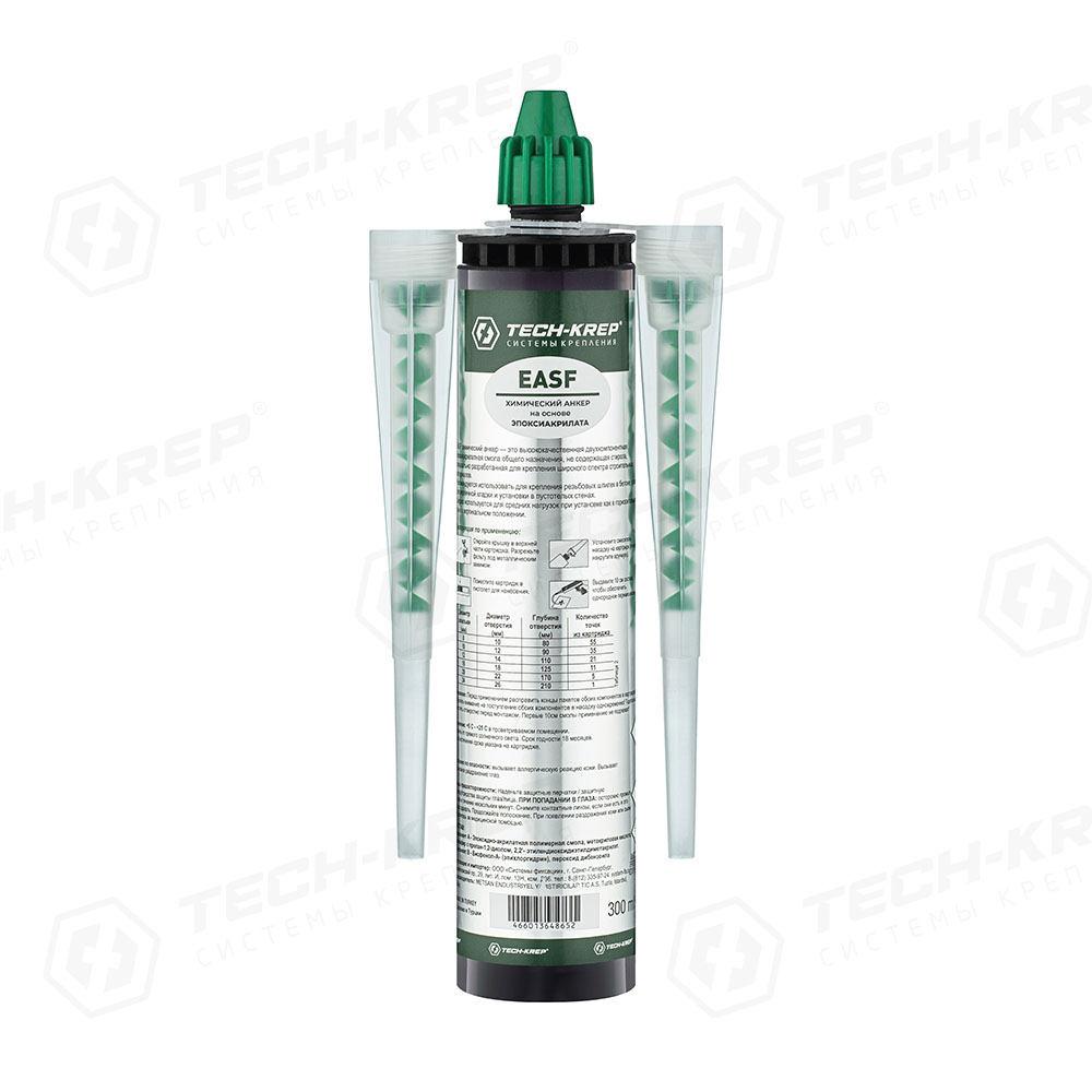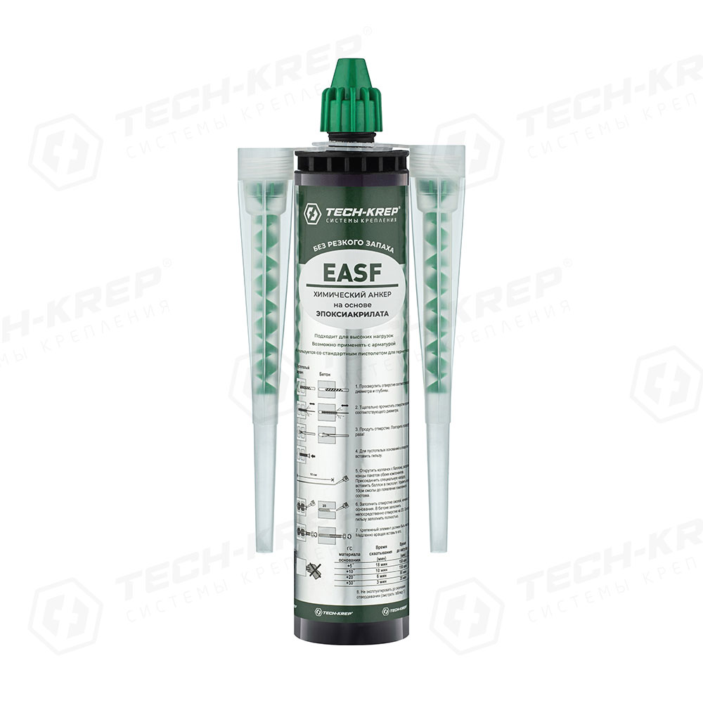 Особенности: подходит для высоких нагрузок. EASF – это двухкомпонентный химический состав на основе синтетической эпокси-акрилатной смолы, не содержит стирол и не имеет запаха. Обладает пониженной вязкостью, что позволяет заполнять отверстия не оставляя пустот, обеспечивая наилучшее связывание и молекулярную адгезию с материалом основания. При увеличении глубины заделки несущая способность химического анкера увеличивается. Подходит для применения в сухом и водонасыщенном бетоне, не создает предварительного напряжения. Химический анкер используется совместно с металлическими анкерными элементами (резьбовыми шпильками, фундаментными болтами, арматурными прутками и т.п.). Подходит для стандартного пистолета под герметик. Картридж, который израсходован не полностью, можно использовать с новым смесителем при условии его хранения с закрытой крышкой.