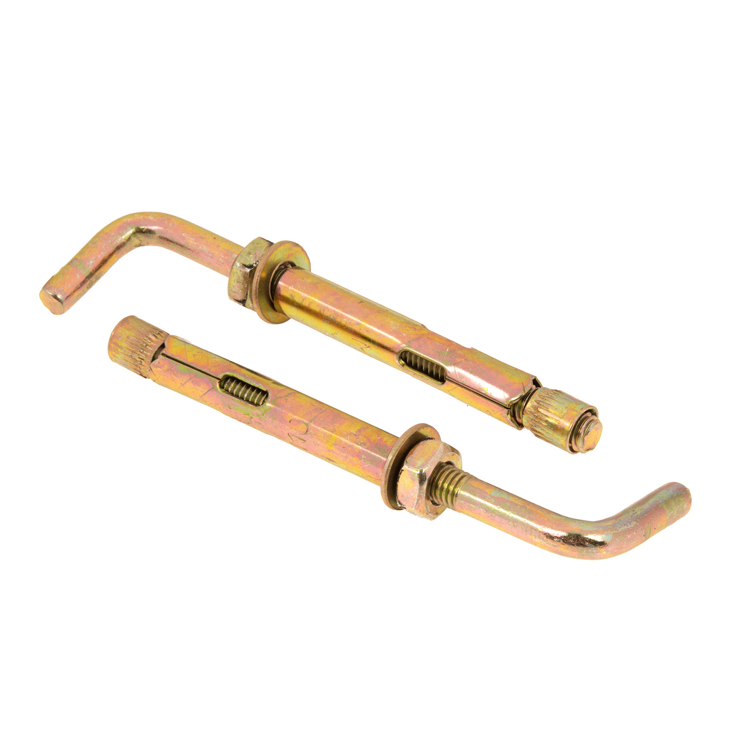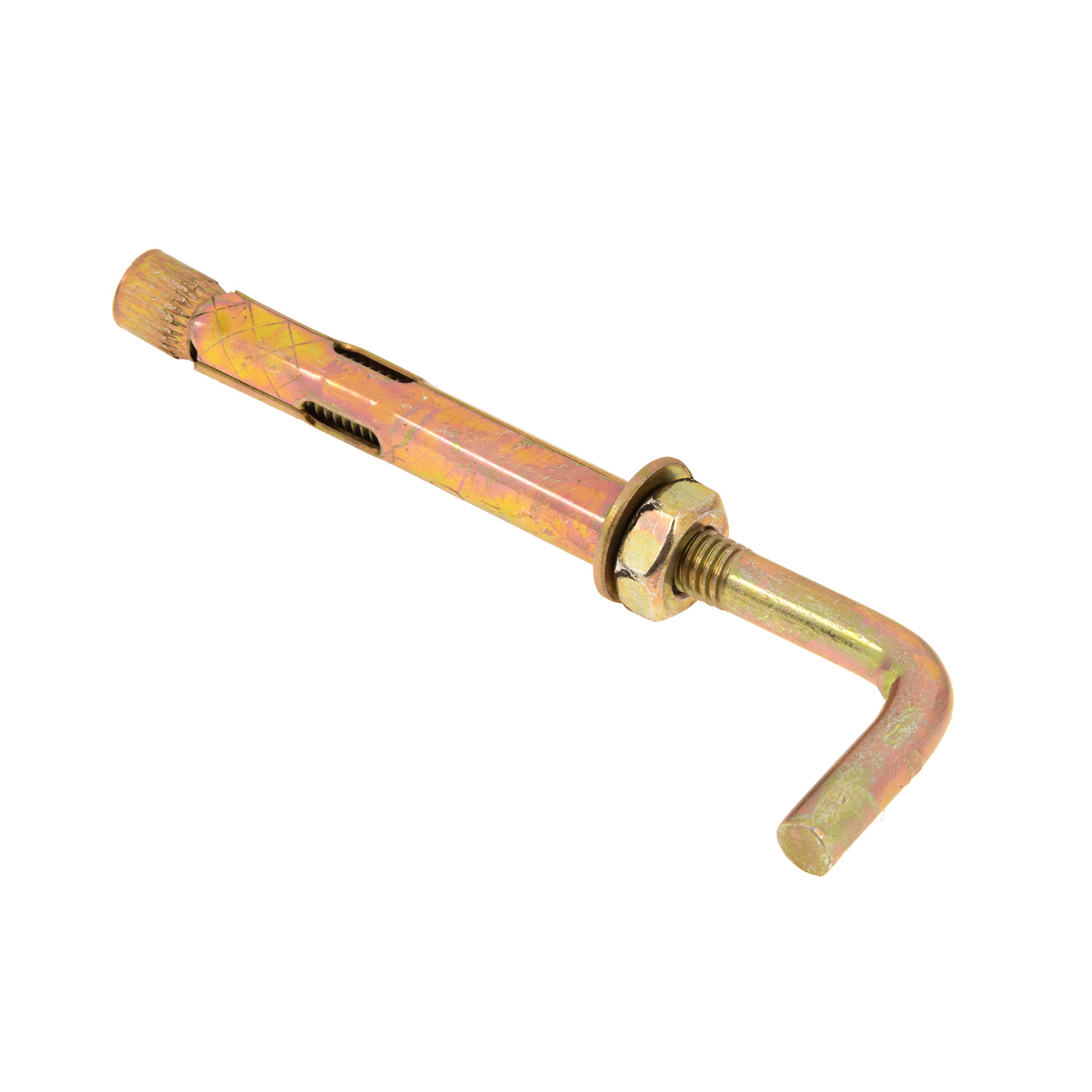 Г-образный анкер изготовлен из стали с желтопассивированным цинковым покрытием. Он оснащен втулкой с распорным концом и внутренним стержнем с резьбой. Устанавливается в подготовленные отверстия с помощью молотка, после чего ввинчивается для распора. Надежность крепления обусловлена большой установочной длиной и сцеплением с плотным основанием. Крепеж подходит для монтажа внутренних и наружных конструкций. Его можно устанавливать близко от края.