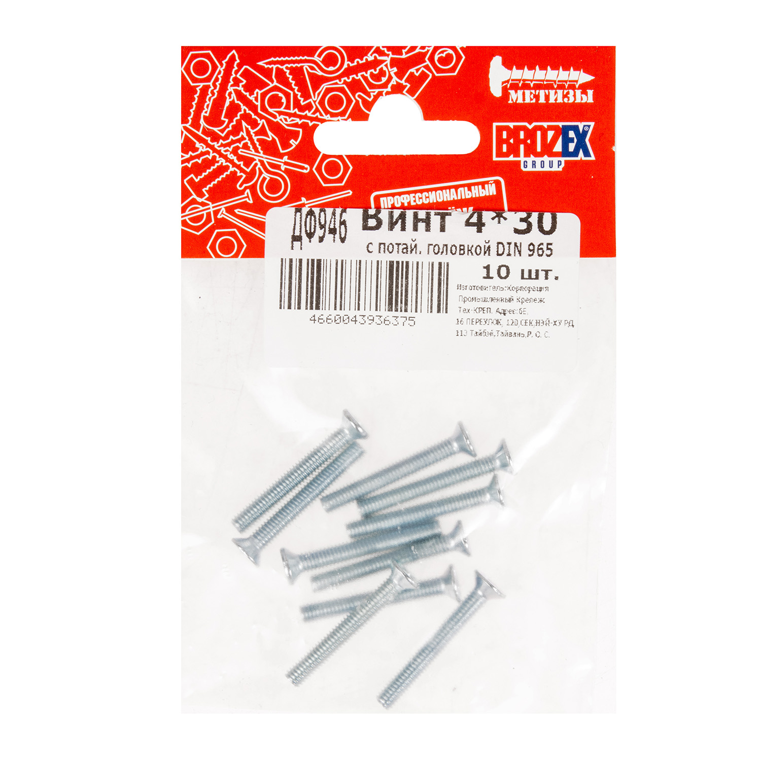 Винт с потайной головкой DIN965 4х30 (10шт) пакет BROZEX *10/100