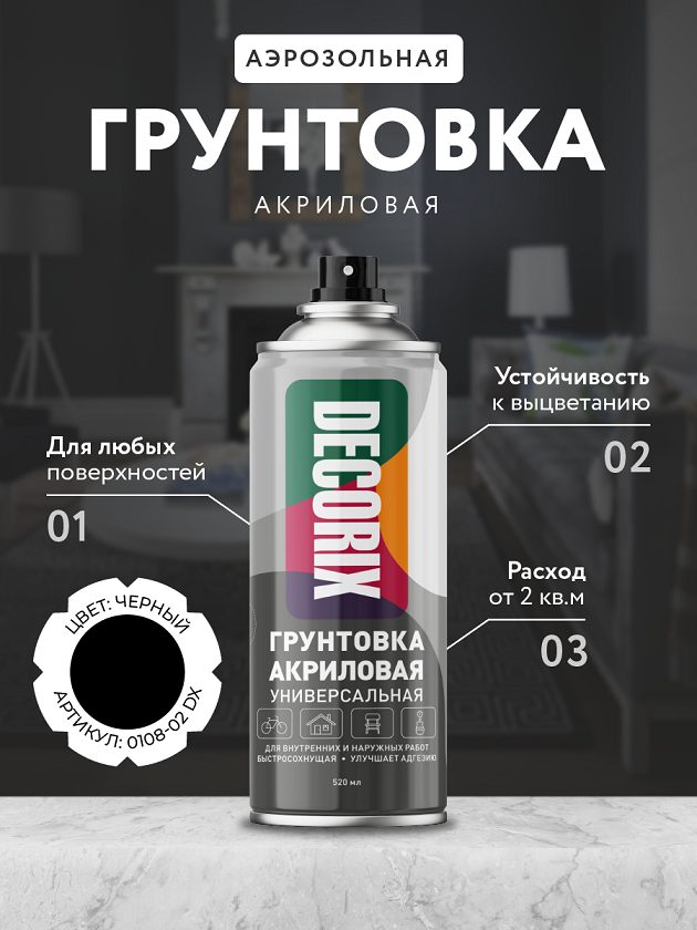Аэрозольная грунтовка акриловая DECORIX, черная (520мл)