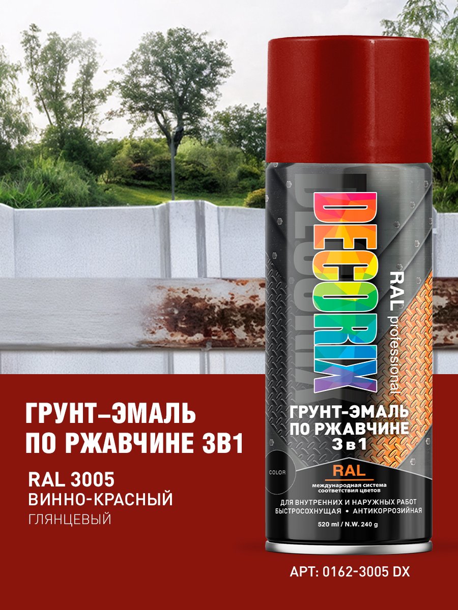 Аэрозольная грунт-эмаль по ржавчине 3 в 1 RAL PROFESSIONAL, 520 мл, RAL 3005, винно-красный глянцевый Decorix 0162-3005 DX применяется для ремонтного окрашивания металлических изделий, инструментов и других видов работ. Аэрозольная грунт-эмаль по ржавчине «3 В 1» удобна для окрашивания не больших поверхностей и труднодоступных мест. Грунт-эмаль образует гладкое глянцевое покрытие, устойчивое к выцветанию.