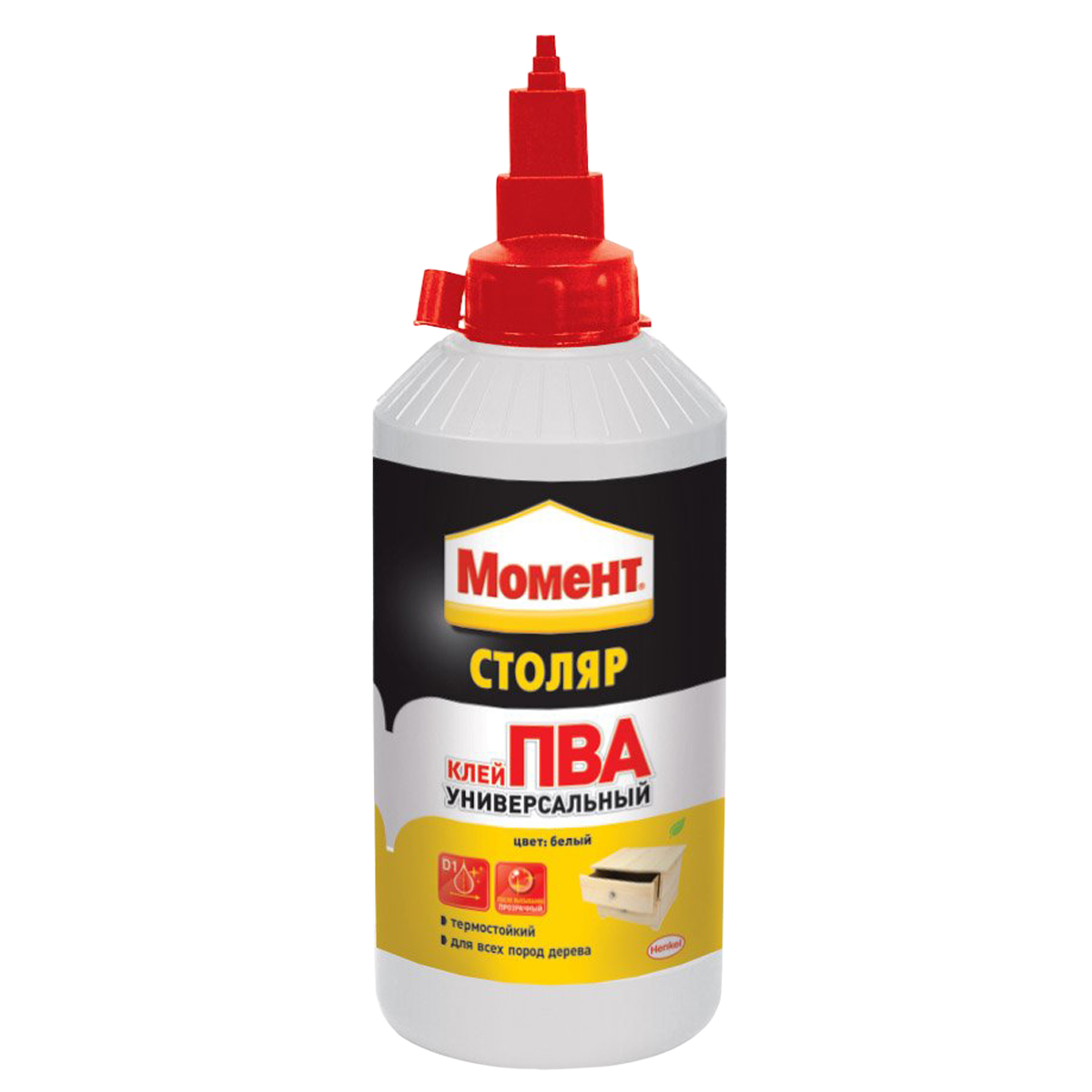 Клей Момент водно-дисперсионный Столяр ПВА Универсальный 750г, 1960504 для монтажного склеивания всех пород дерева, ДСП, ДВП, МДФ,многослойной фанеры, для приклеивания декоративного бумажно-слоистого пластика и шпона.