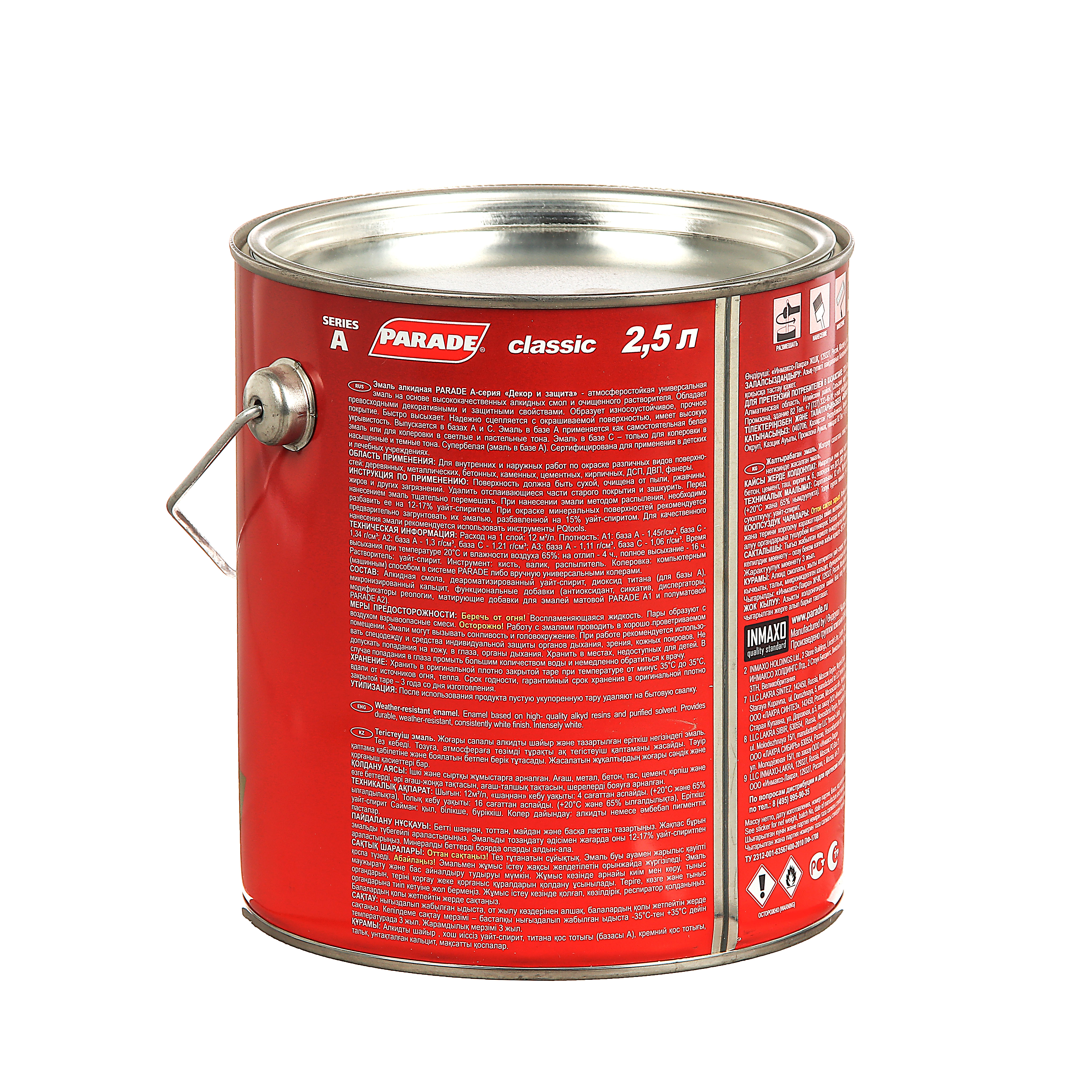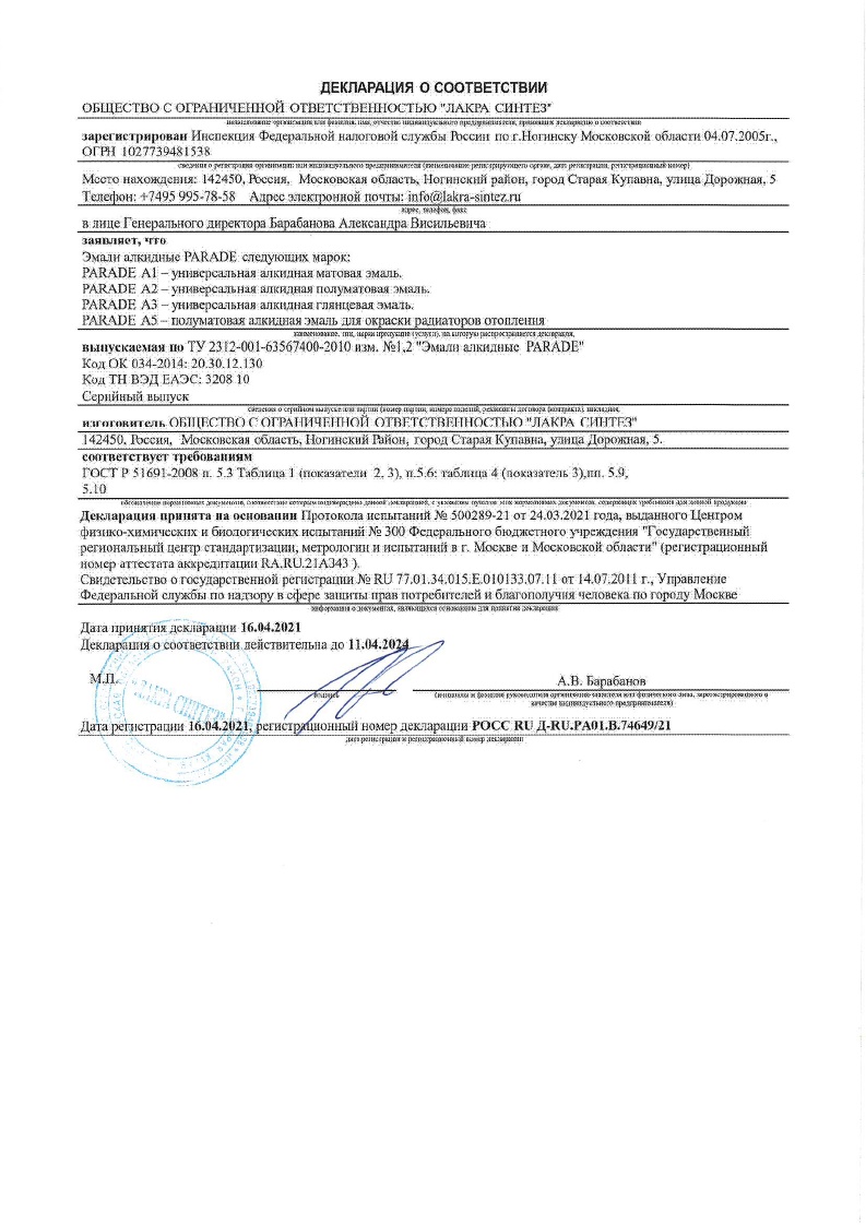 Тип поверхности: Деревянные, металлические, бетонные, каменные, цементные, кирпичные и другие поверхности, а также ДСП, ДВП, фанера. Время высыхания: При температуре 20°С и относительной влажности 65%: на отлип, не более: 4 ч. полное высыхание, не более: 16 ч. Расход: 12 м2/л (на 1 слой) Плотность: База А – 1,11 г/см3 Цвет в таре/Колеровка: База А – белый. Эмаль в базе А - компьютерная колеровка PARADE (машинным) способом или вручную универсальными колерами. Основа: Алкидная смола. Разбавитель: Уайт-спирит