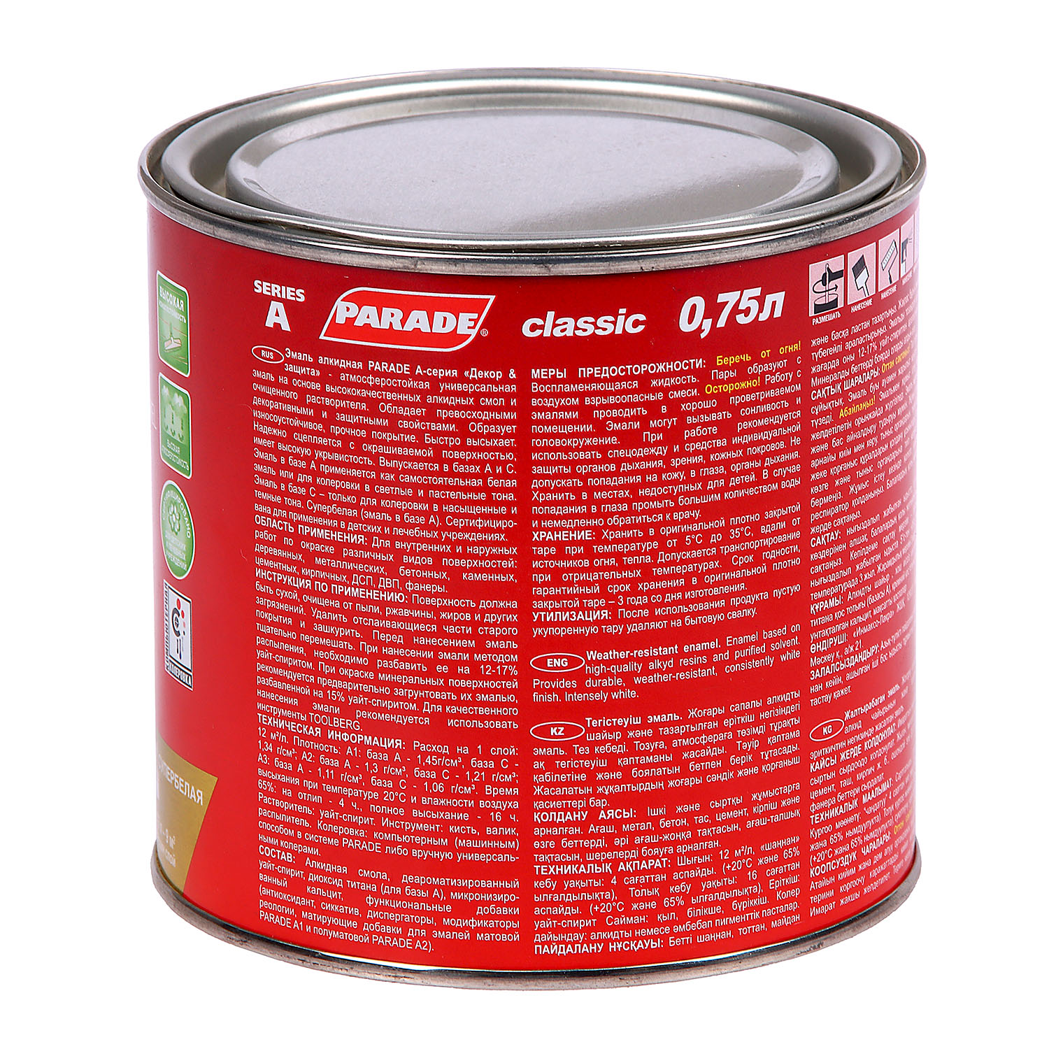 Тип поверхности: Деревянные, металлические, бетонные, каменные, цементные, кирпичные и другие поверхности, а также ДСП, ДВП, фанера. Время высыхания: При температуре 20°С и относительной влажности 65%: на отлип, не более: 4 ч. полное высыхание, не более: 16 ч. Расход: 12 м2/л (на 1 слой) Плотность: База А – 1,30 г/см3, база С – 1,21 г/см3 Цвет в таре/Колеровка: База А – белый, база С – бесцветный. Эмали базы А и С - компьютерная колеровка PARADE (машинным) способом или вручную универсальными колерами. Основа: Алкидная смола. Разбавитель: Уайт-спирит