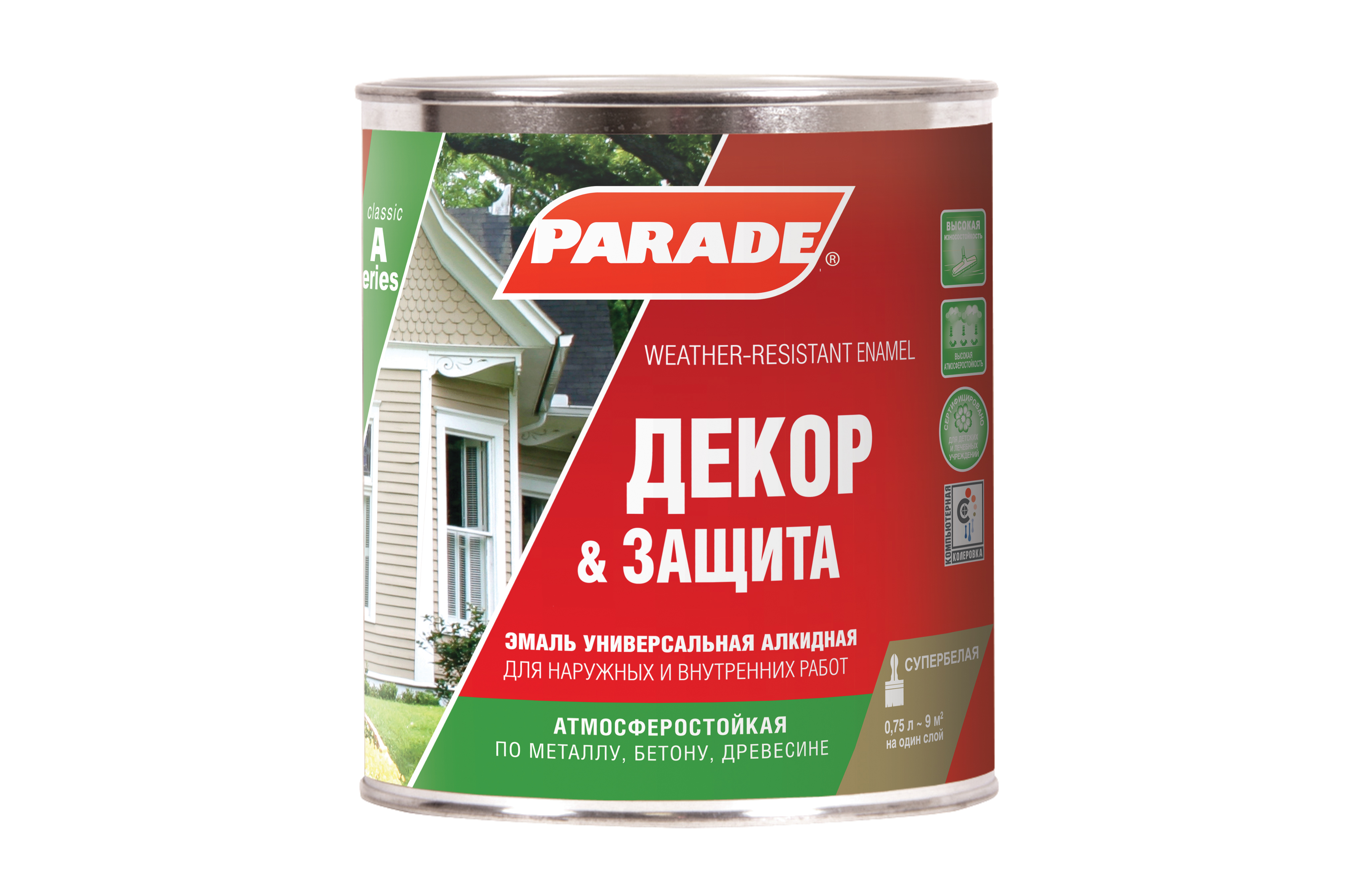 Эмаль на основе высококачественных алкидных смол и очищенного растворителя. Образуемая пленка обладает высокими декоративными и защитными свойствами. Для внутренних и наружных работ Супербелое покрытие с высокими декоративными свойствами Различные степени блеска: А1 - матовая, А2 - полуматовая, А3 - глянцевая Высокая атмосферостойкость и износостойкость Отличная укрывистость, прочное сцепление с окрашиваемой поверхностью Быстро высыхает Сертифицирована для применения в детских и лечебных учреждениях Колеровка компьютерная по системе PARADE или универсальными колерами