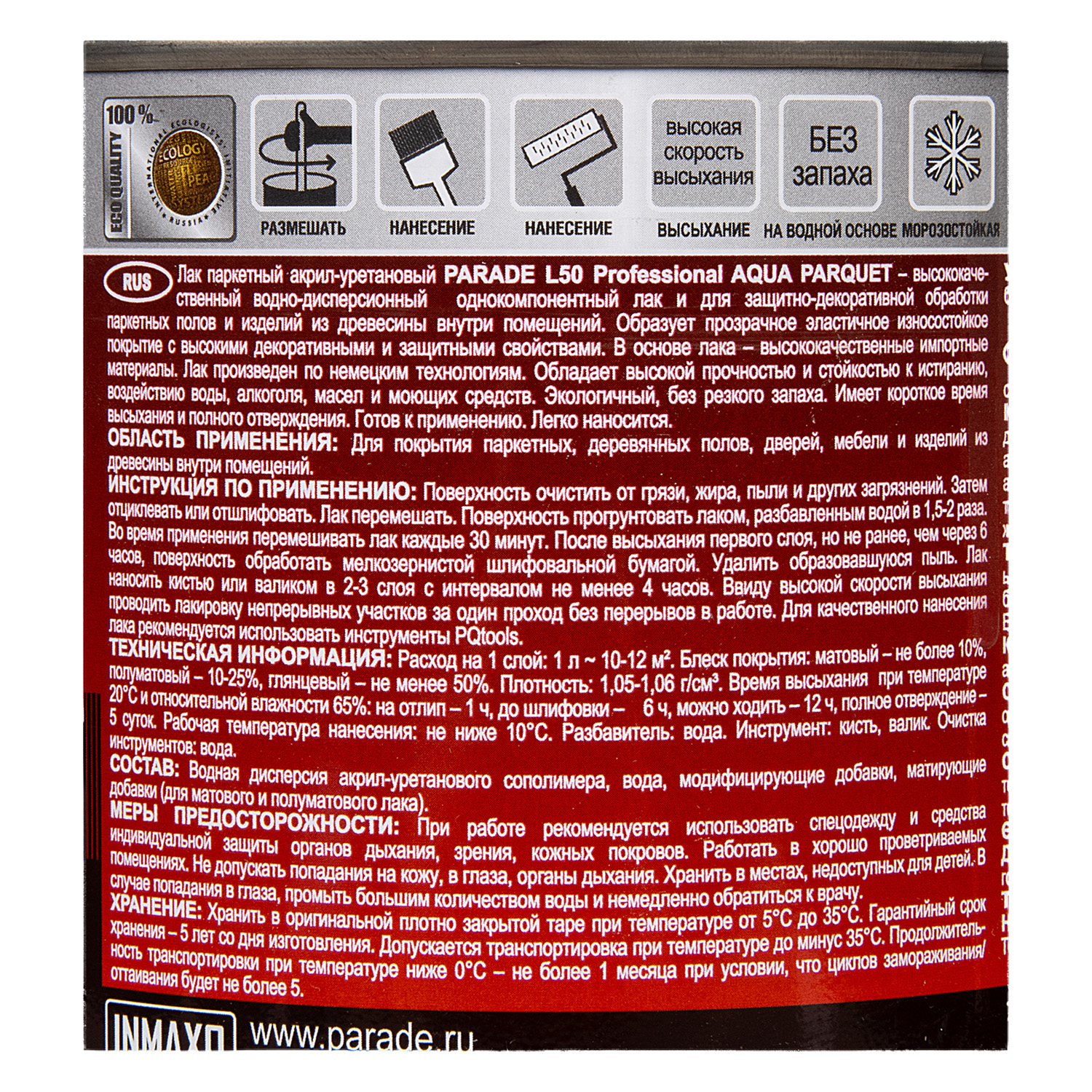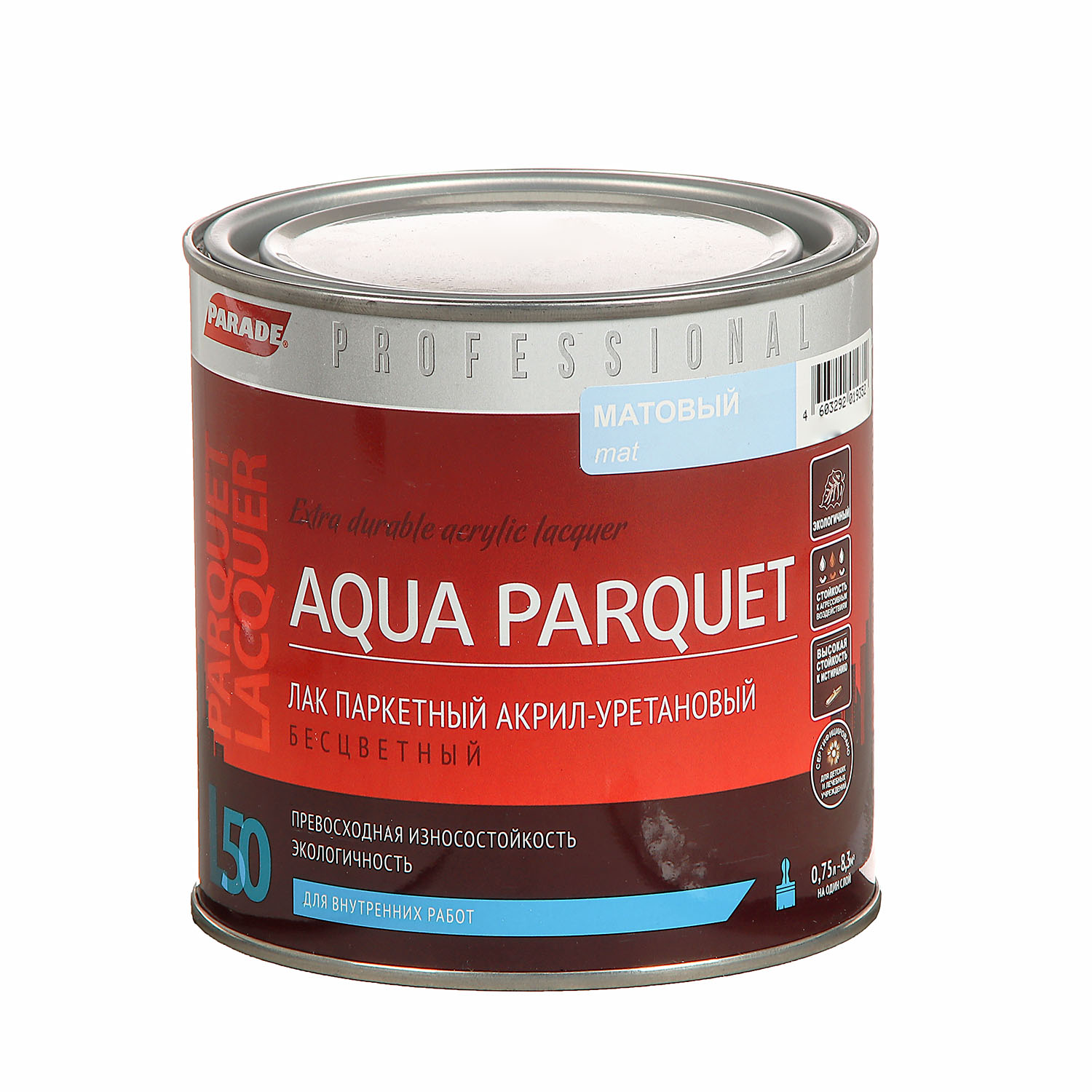 Лак акрил-уретановый паркетный матовый 0,8 л PARADE L-50 *1/6/432