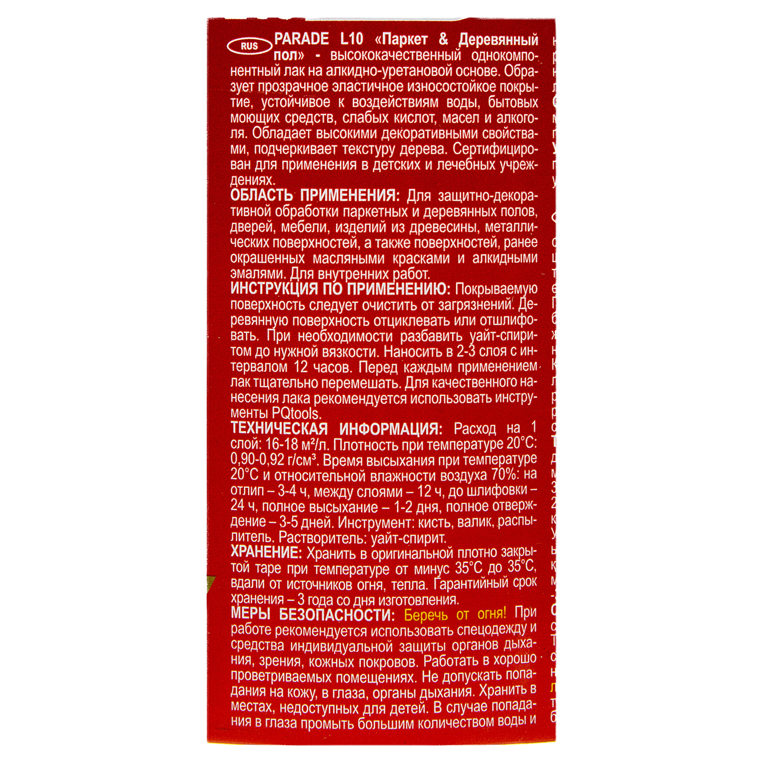 Лак алкидно-уретановый паркетный. Высокая стойкость к истиранию. Для внутренних работ.