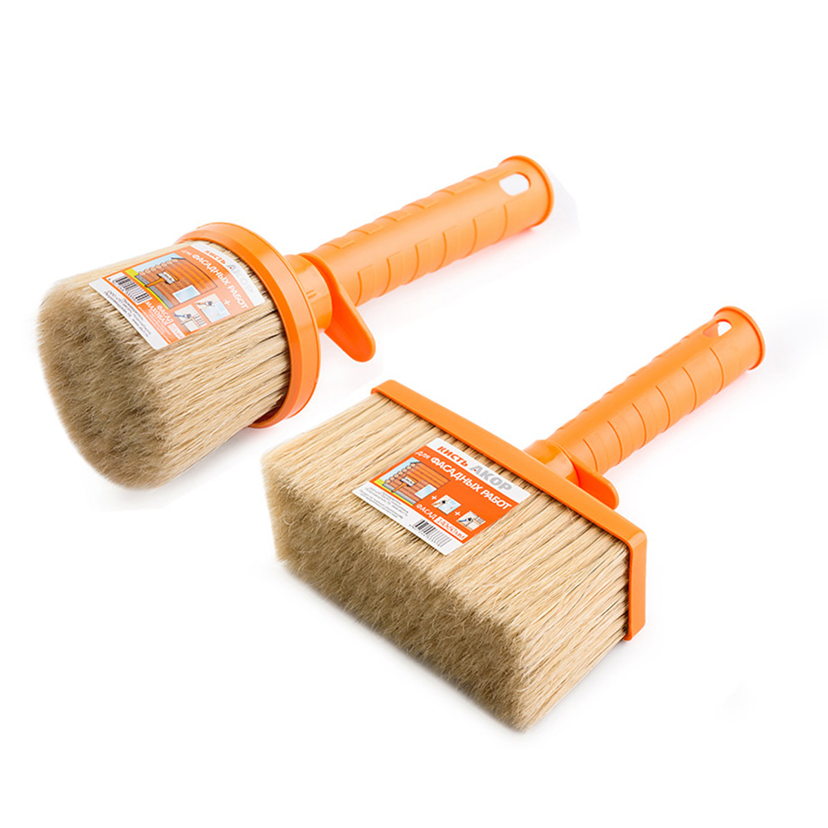 Кисть маховая, кустовая набивка. Светлая натуральная щетина обеспечивает высокое качество покраски и долговечность кисти. Имеет съемную пластиковую ручку, которая дает возможность крепления телескопического или резьбового удлинителя. Ручка полая с отверстием для фиксации удлинителя или для подвешивания.