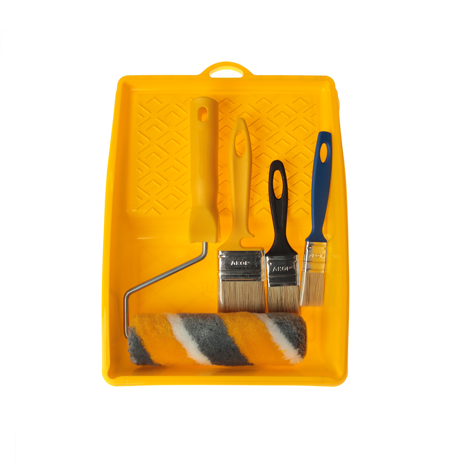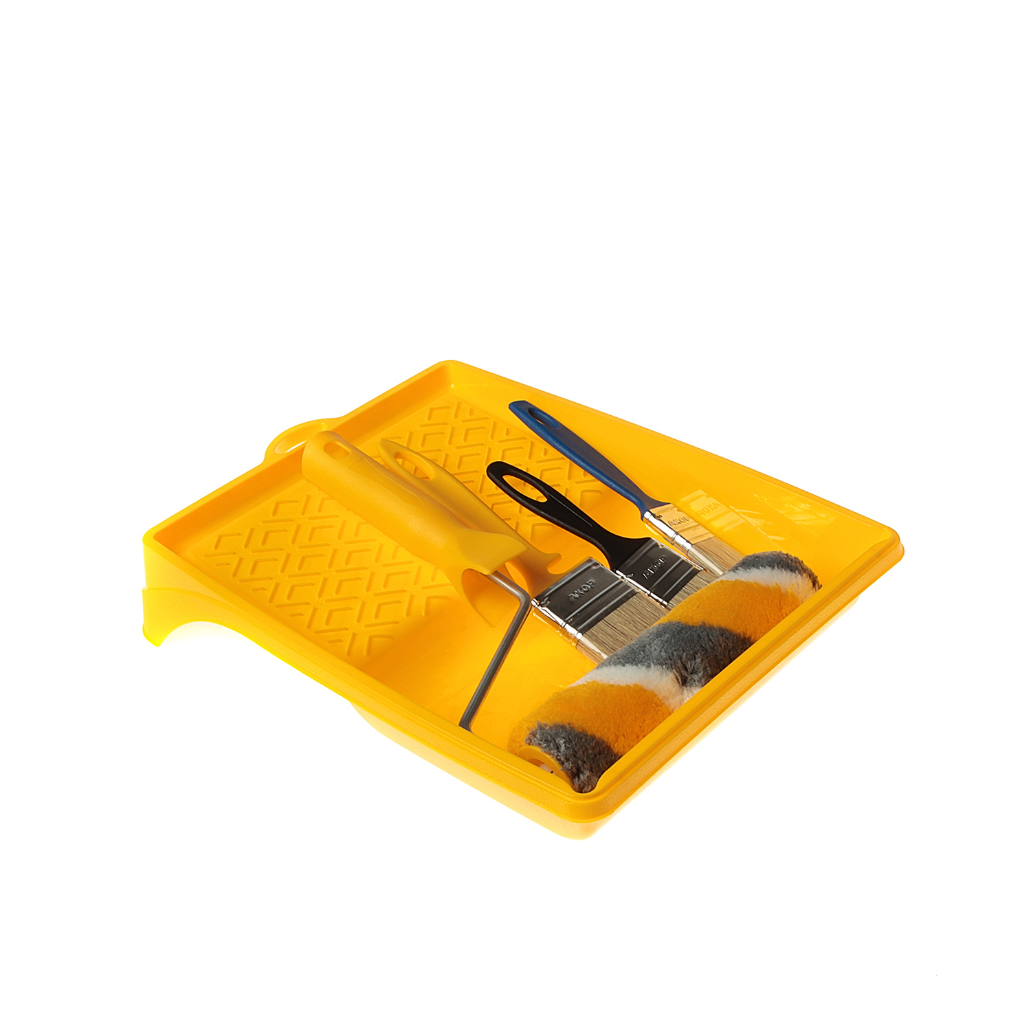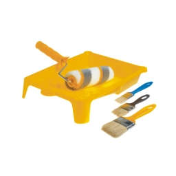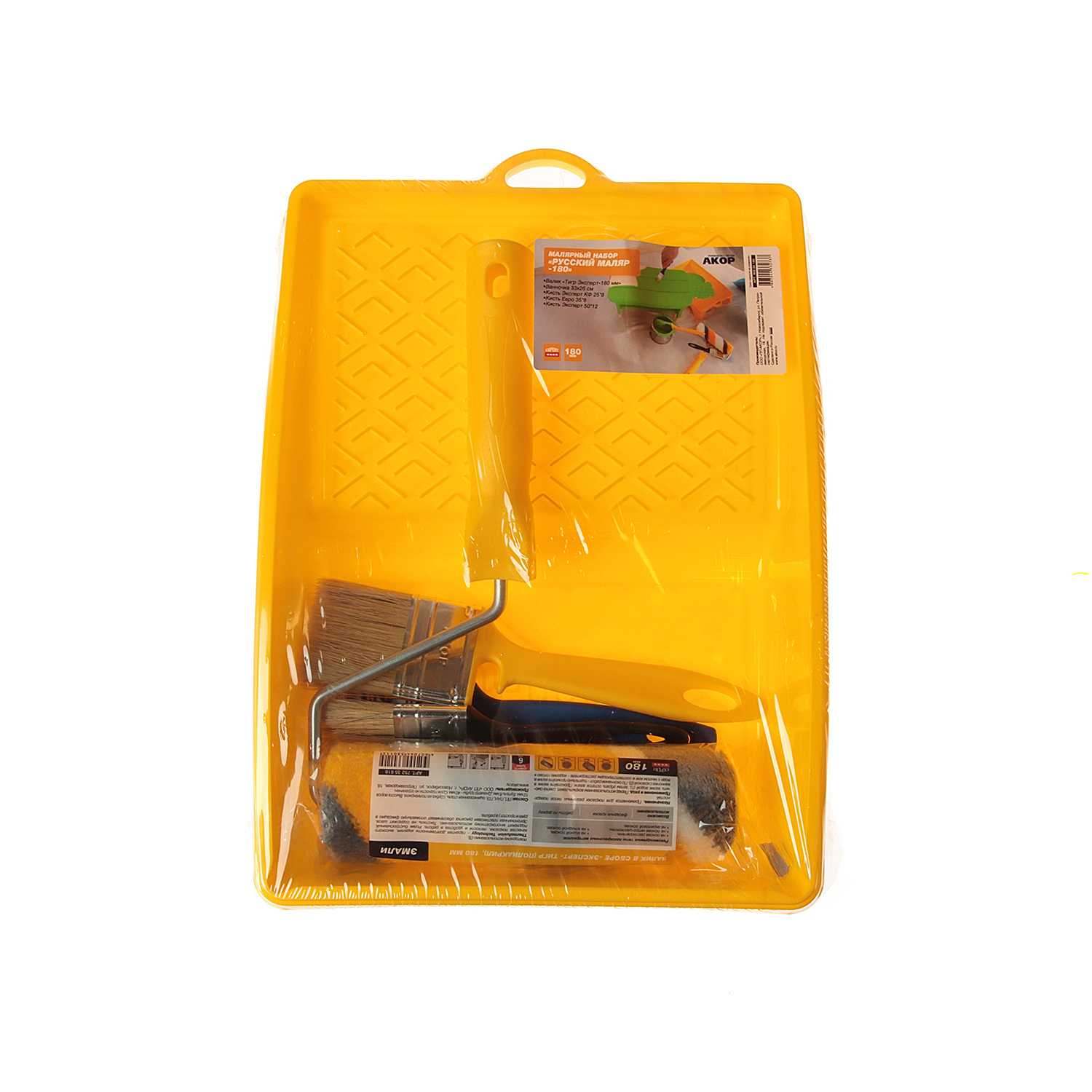 Малярный набор универсальный. Валик и кисти подходят для нанесения ЛКМ: эмали,краски на водной основе,клеи,грунтовки. Бюгель с эргономичной рукояткой обеспечивает удобство работы и снижает усталость в руках при длительной работе. Кювета выполнена из пластмассы высокого качества, поэтому устойчива к механическим нагрузкам. Благодаря специальной конструкции кюветы излишки краски стекают в ванночку, а не скапливаются на раскаточной доске, это обеспечивает экономный расход материалов.