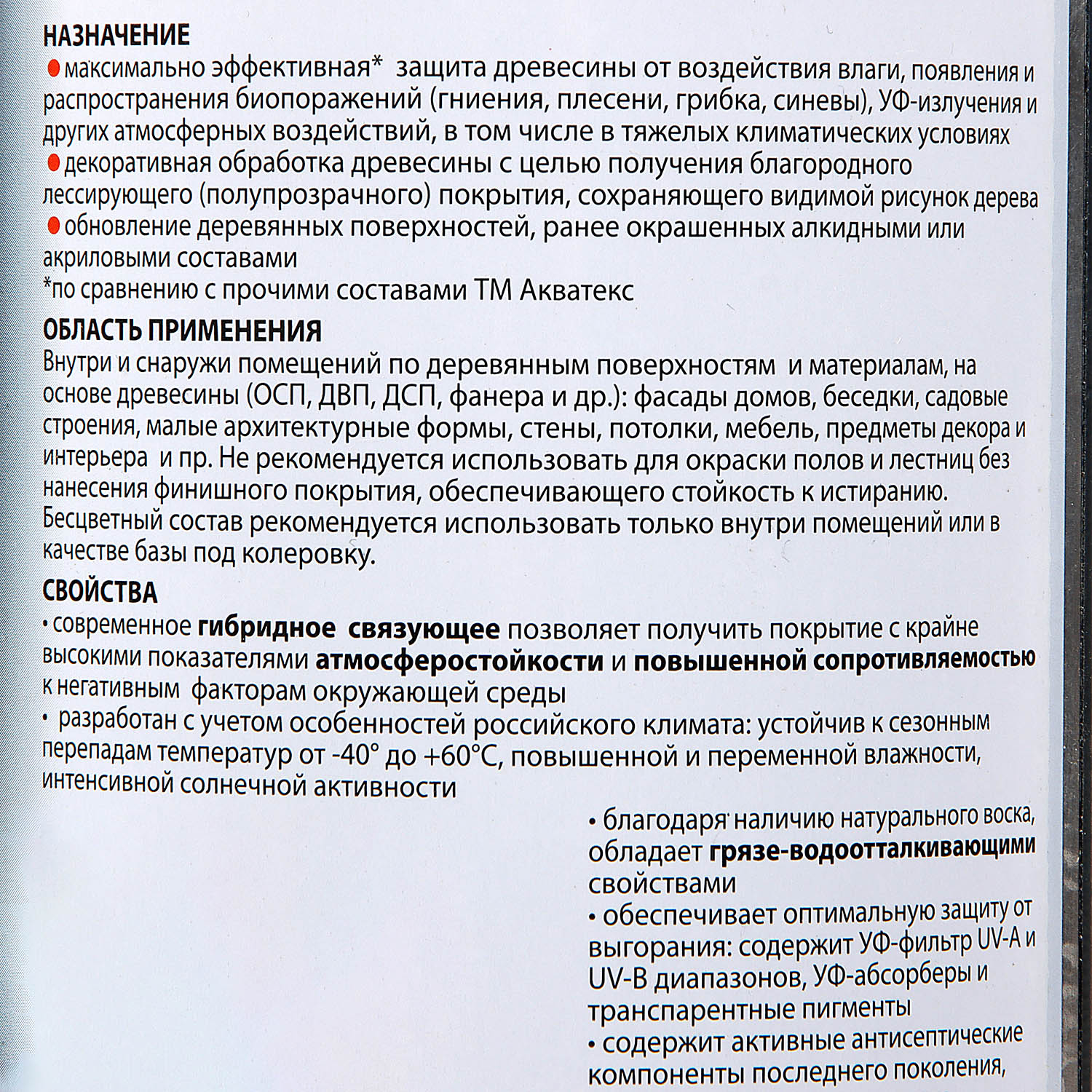 максимально эффективная* защита древесины от воздействия влаги, появления и распространения биопоражений (гниения, плесени, грибка, синевы), УФ-излучения и других атмосферных воздействий, в том числе в тяжелых климатических условиях