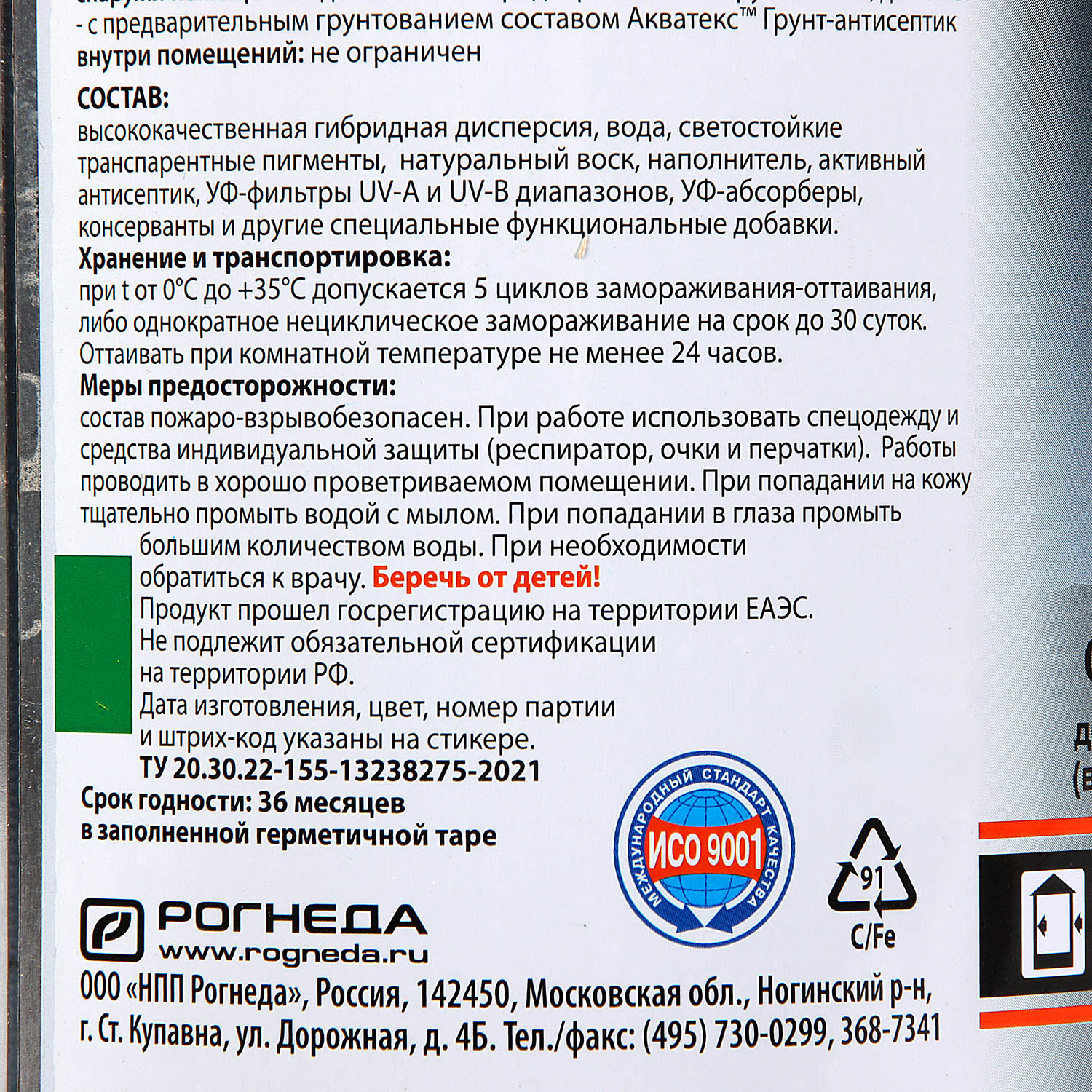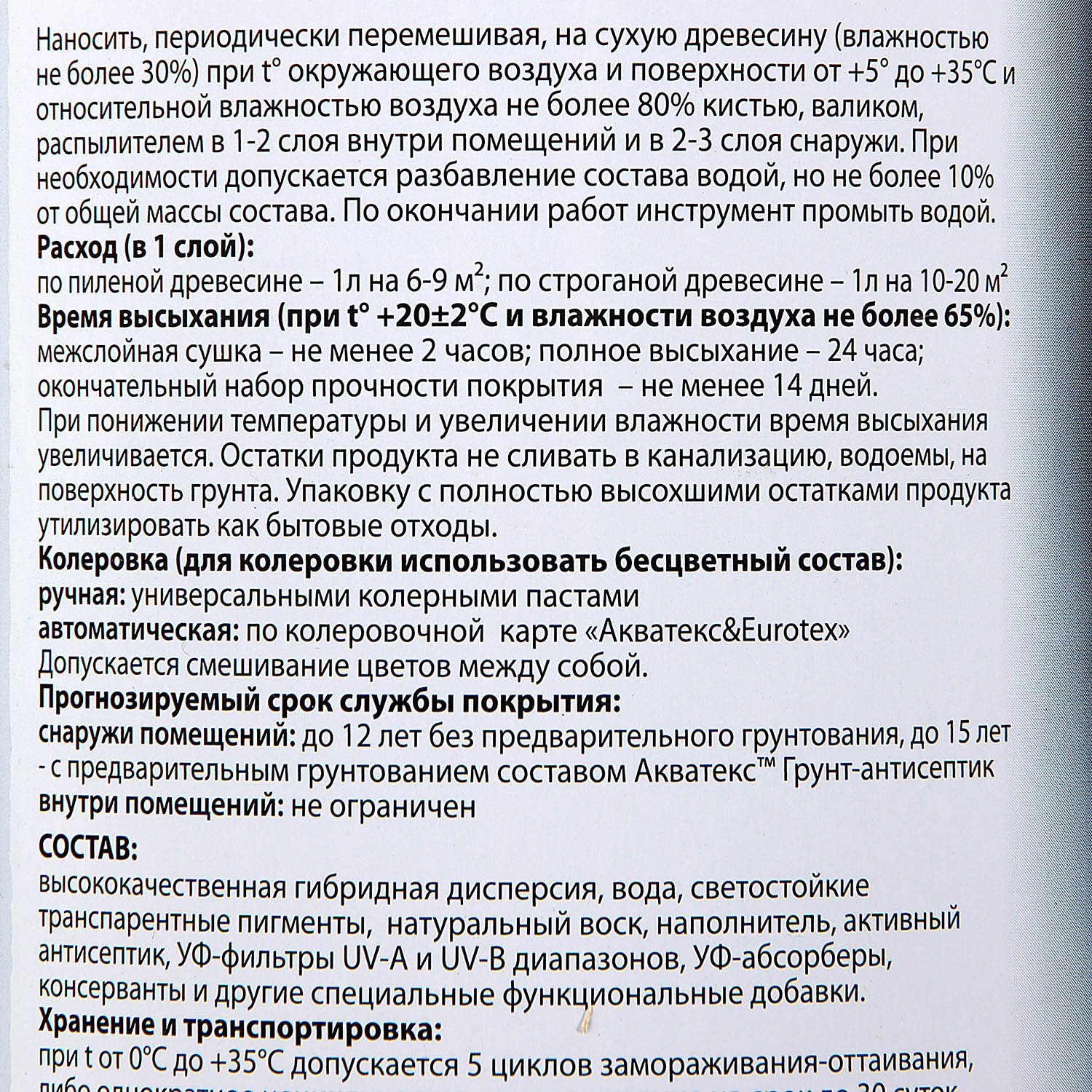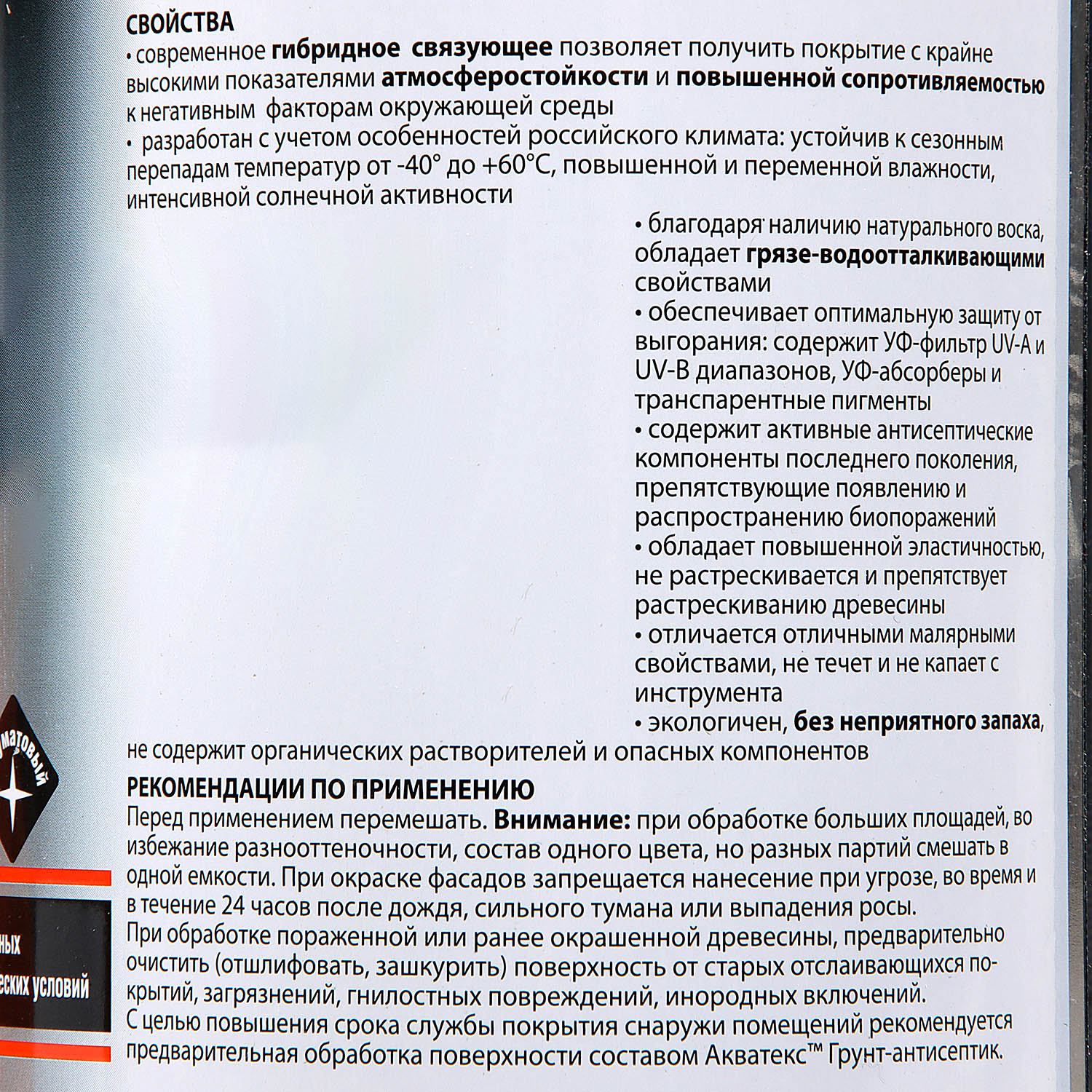 Состав    высококачественная гибридная дисперсия, вода, светостойкие транспарентные пигменты, натуральный воск, наполнитель, активный антисептик, Уф-фильтры UV-A и UV-B диапазонов, УФ-абсорберы, консерванты и другие специальные функциональные добавки