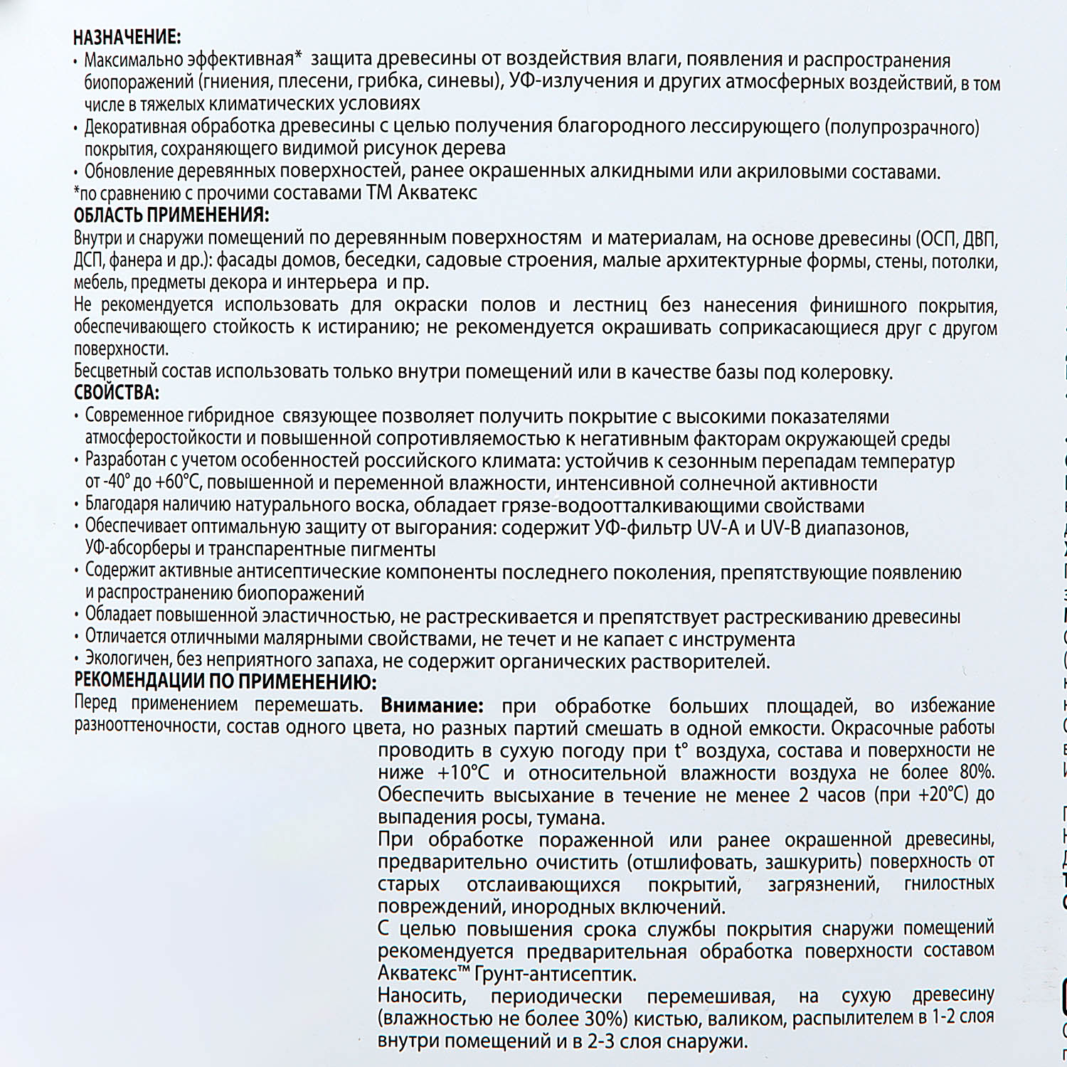 максимально эффективная* защита древесины от воздействия влаги, появления и распространения биопоражений (гниения, плесени, грибка, синевы), УФ-излучения и других атмосферных воздействий, в том числе в тяжелых климатических условиях
