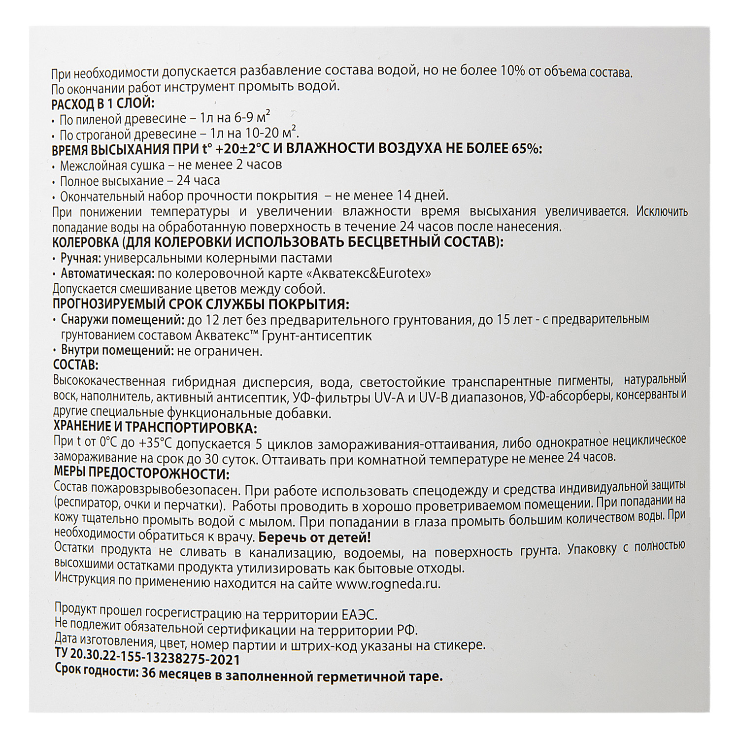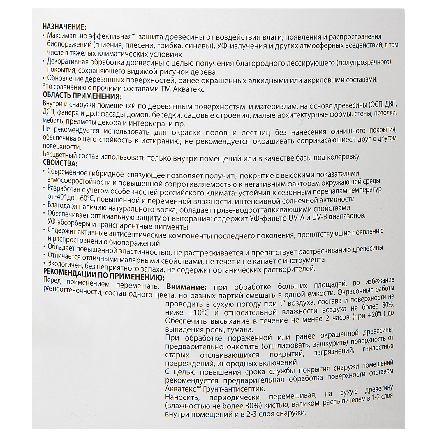 максимально эффективная* защита древесины от воздействия влаги, появления и распространения биопоражений (гниения, плесени, грибка, синевы), УФ-излучения и других атмосферных воздействий, в том числе в тяжелых климатических условиях