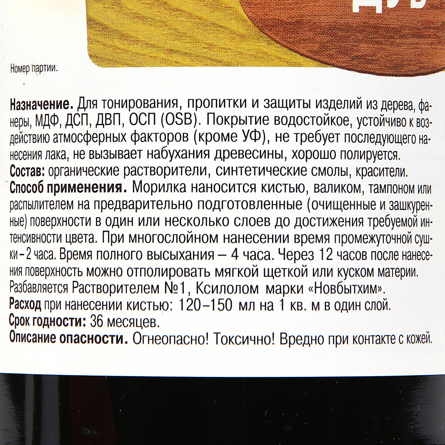 Морилка неводная предназначена для тонирования, пропитки и защиты деревянных изделий, эксплуатирующихся в атмосферных условиях и внутри помещений. Покрытие хорошо полируется, не требует обязательного покрытия лаком, однако для придания глянца сверху на слой морилки можно нанести лак ХВ-784, лак "Цапон" или Яхтный лак "Главный технолог" производства "Новбытхим". Морилка не вызывает набухания древесины. Она изготовлена на основе органических растворителей и не смывается водой.