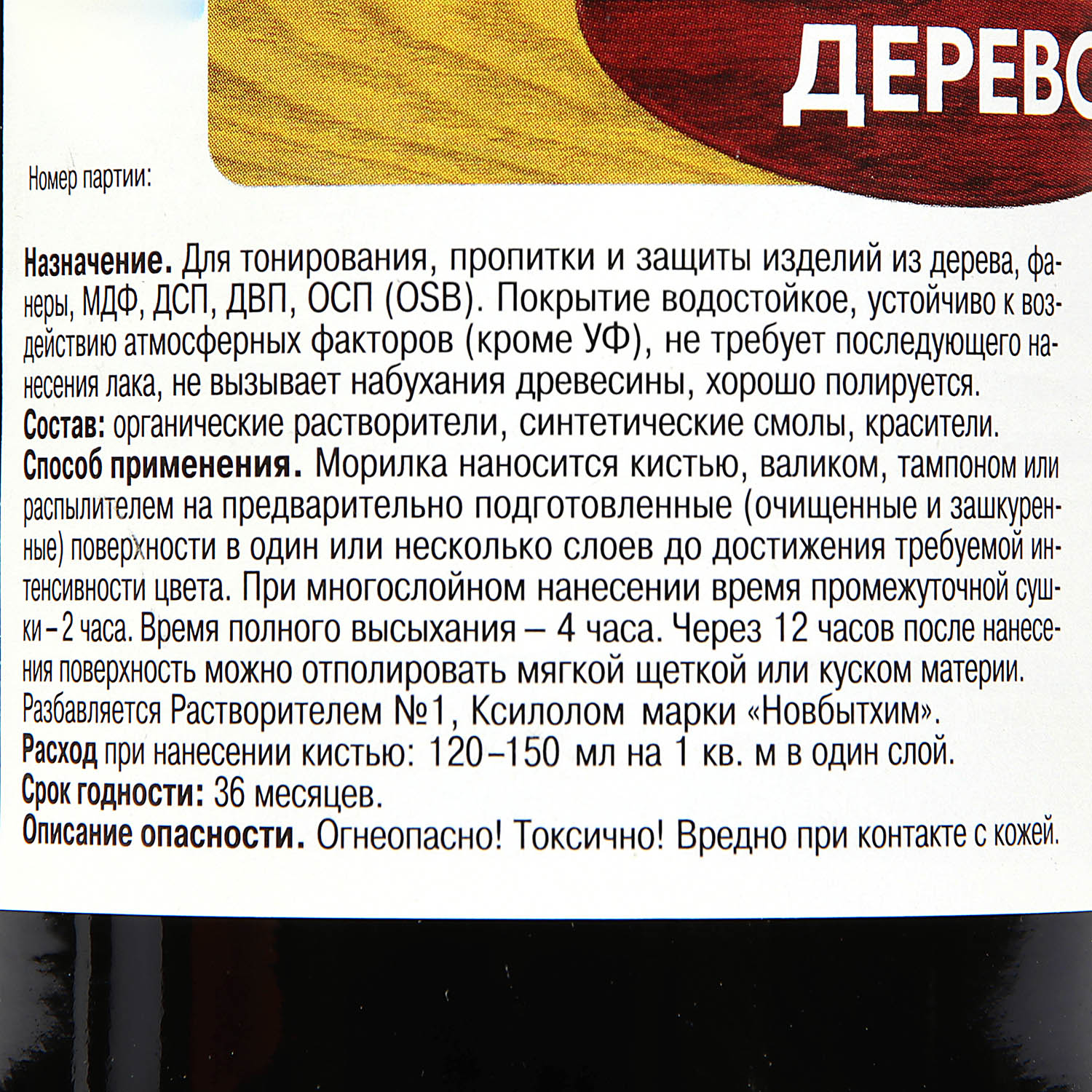 Морилка неводная предназначена для тонирования, пропитки и защиты деревянных изделий, эксплуатирующихся в атмосферных условиях и внутри помещений. Покрытие хорошо полируется, не требует обязательного покрытия лаком, однако для придания глянца сверху на слой морилки можно нанести лак ХВ-784, лак "Цапон" или Яхтный лак "Главный технолог" производства "Новбытхим". Морилка не вызывает набухания древесины. Она изготовлена на основе органических растворителей и не смывается водой.