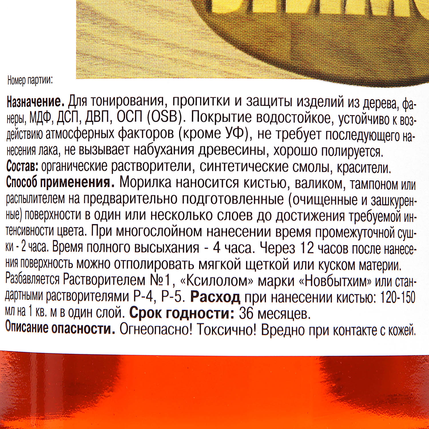 Морилка неводная предназначена для тонирования, пропитки и защиты деревянных изделий, эксплуатирующихся в атмосферных условиях и внутри помещений. Покрытие хорошо полируется, не требует обязательного покрытия лаком, однако для придания глянца сверху на слой морилки можно нанести лак ХВ-784, лак "Цапон" или Яхтный лак "Главный технолог" производства "Новбытхим". Морилка не вызывает набухания древесины. Она изготовлена на основе органических растворителей и не смывается водой.