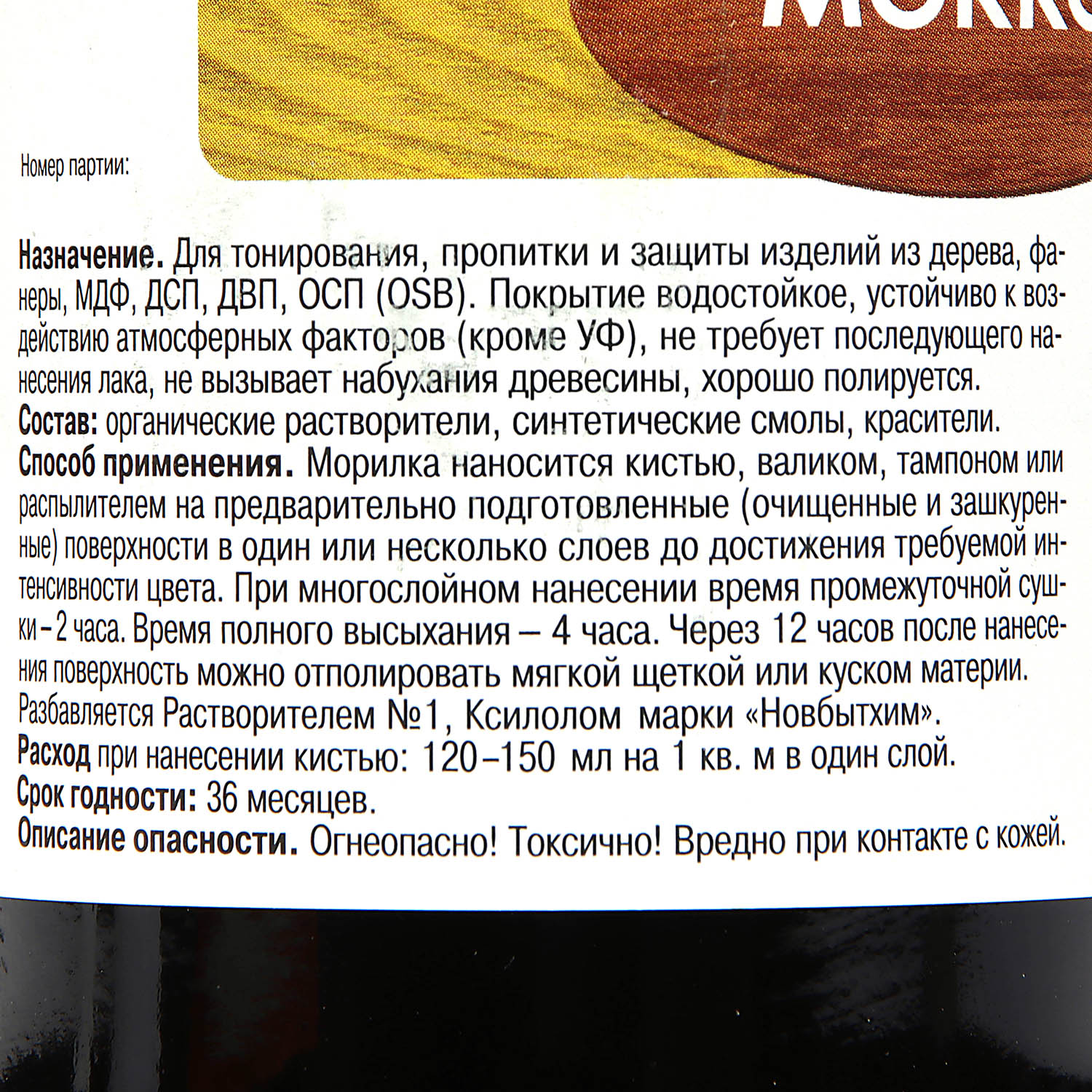 Морилка неводная предназначена для тонирования, пропитки и защиты деревянных изделий, эксплуатирующихся в атмосферных условиях и внутри помещений. Покрытие хорошо полируется, не требует обязательного покрытия лаком, однако для придания глянца сверху на слой морилки можно нанести лак ХВ-784, лак "Цапон" или Яхтный лак "Главный технолог" производства "Новбытхим". Морилка не вызывает набухания древесины. Она изготовлена на основе органических растворителей и не смывается водой.