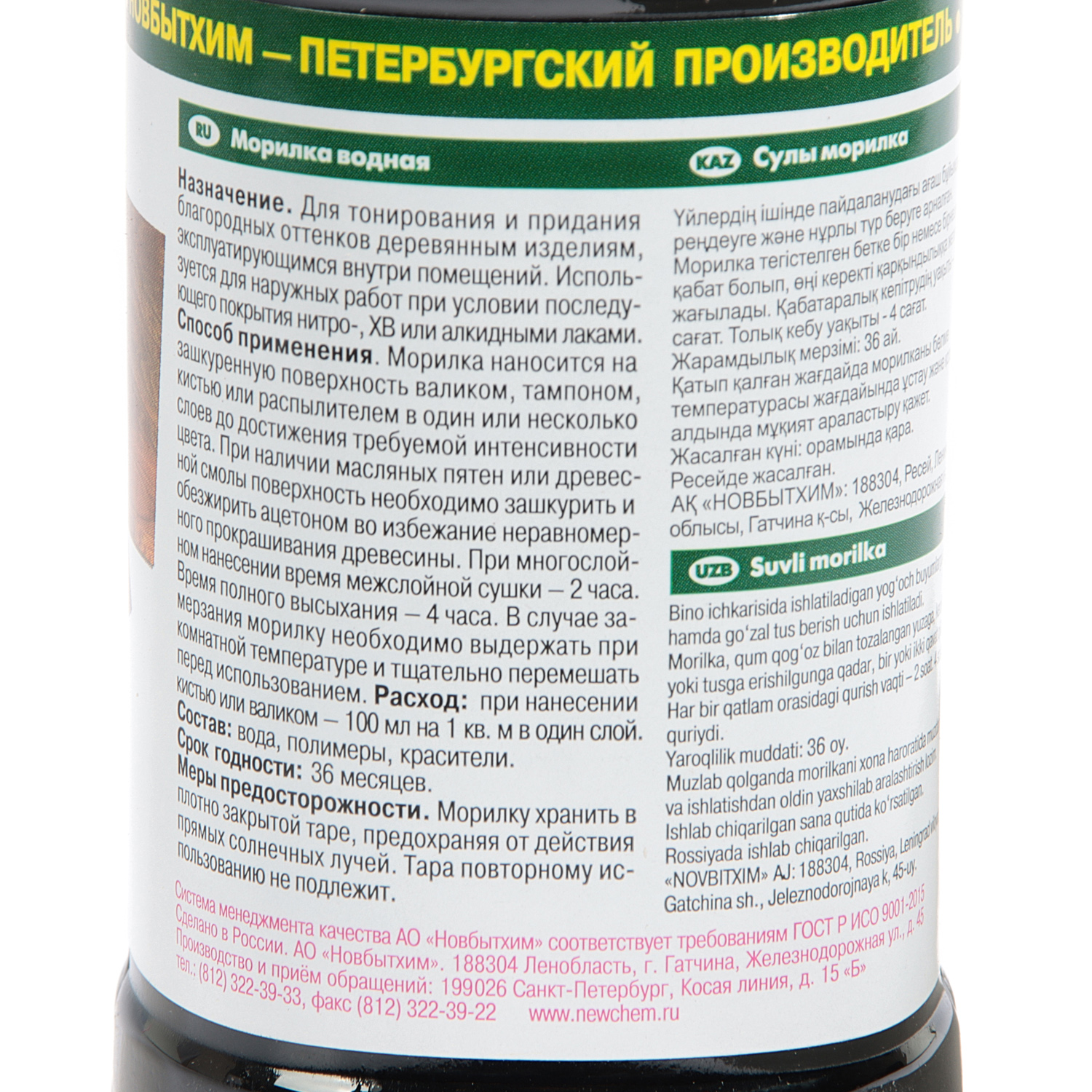 Морилка водная предназначена для тонирования и придания благородных оттенков деревянным изделиям, эксплуатирующимся внутри помещений. Может использоваться для наружных работ при условии последующего покрытия лаком ХВ-784, лаком "Цапон", Лаком для дерева акрилатным, Лаком яхтным "Главный технолог" производства компании "Новбытхим".