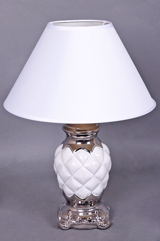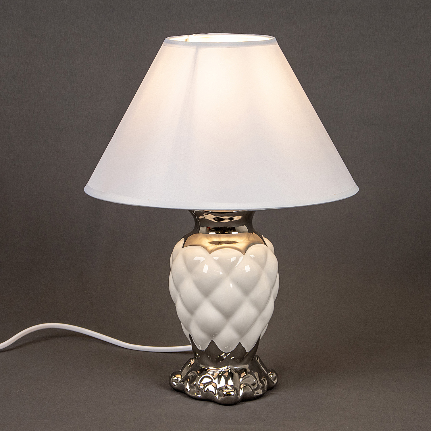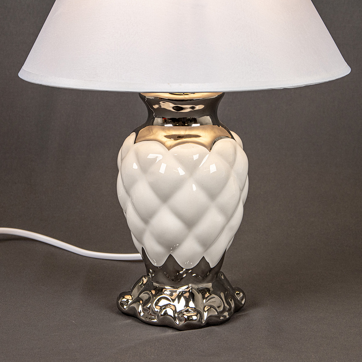 вид-светильник с абажуром, стиль-классика, высота изделия, 340мм, диаметр изделия, 260мм, материал основания-керамика, цвет основания белый, материал плафона-текстиль, цвет плафона-белый, степень защиты IP20, Макс. площадь помещения, 1 м2.